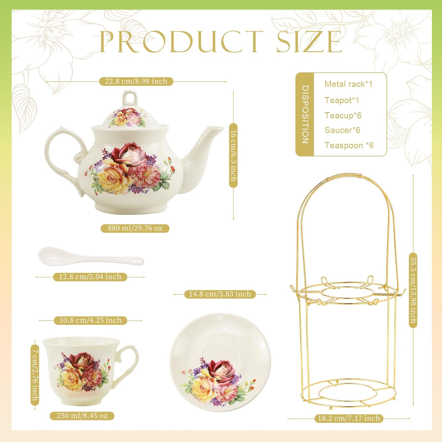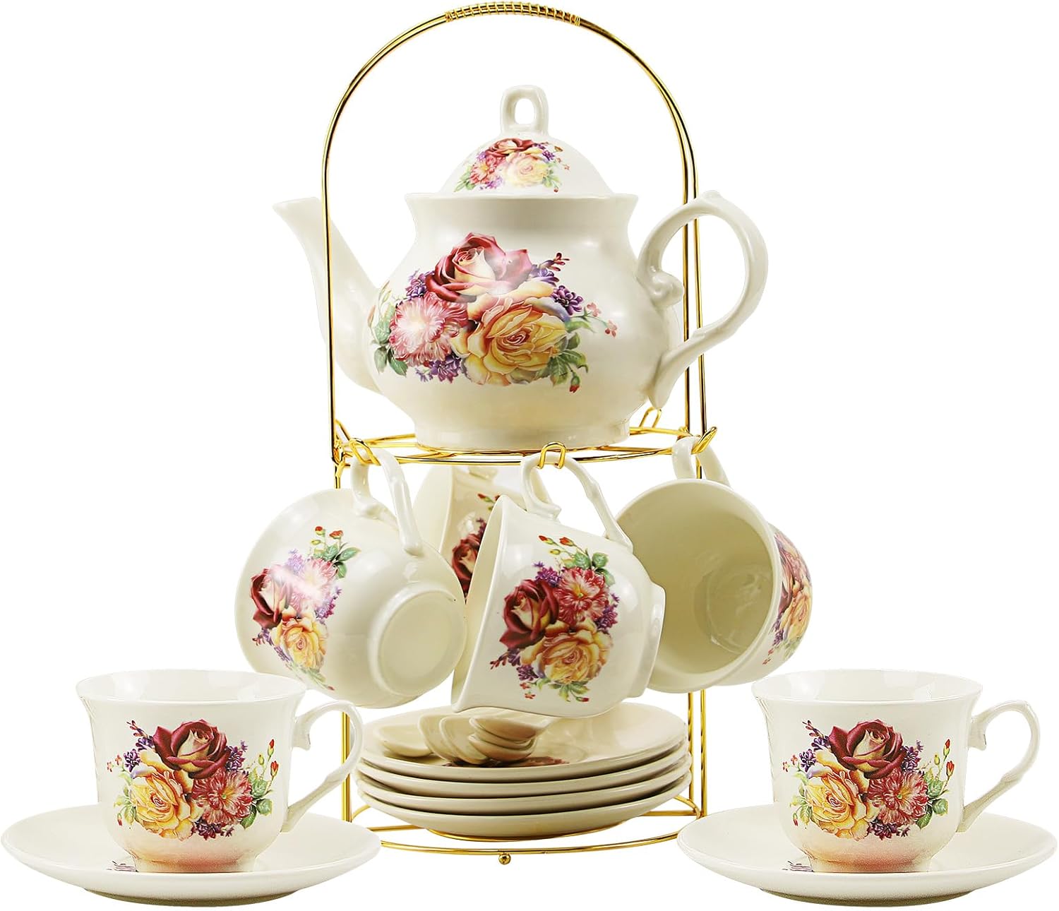 - The package: This exquisite tea set has 1 teapot, 6 cups, 6 saucers, 6 spoons, and 1 spray gold shelf.