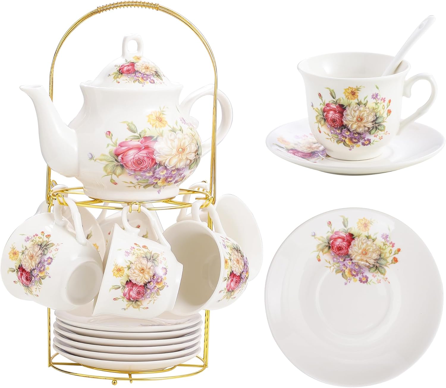 20-Pieces Porcelain Tea Sets For Women, Tea Set For Adult with Golden Metal Rack,Tea Gift Sets for Home&Party(012)