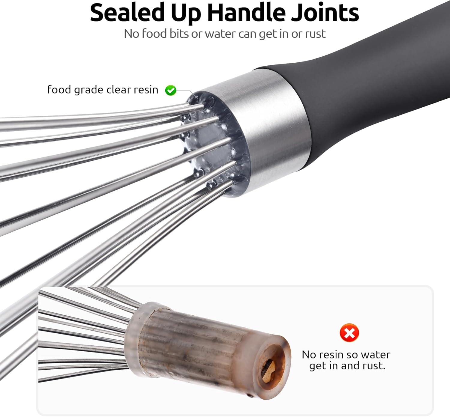- [Sealed Up with Clear Food Grade Resin] U-Taste balloon whisk is sealed up around the base of the wires where they join the handle with food grade resin to ensure that the no food bits or water can get in or rust. You can use this metal whisk for beating, whisking and whipping task without worrying about the food get caught up in the handle and wire. The right size for scrambling a few eggs and mixing salad dressings, making personal servings of dishes, blending sauces and making hot chocolate.