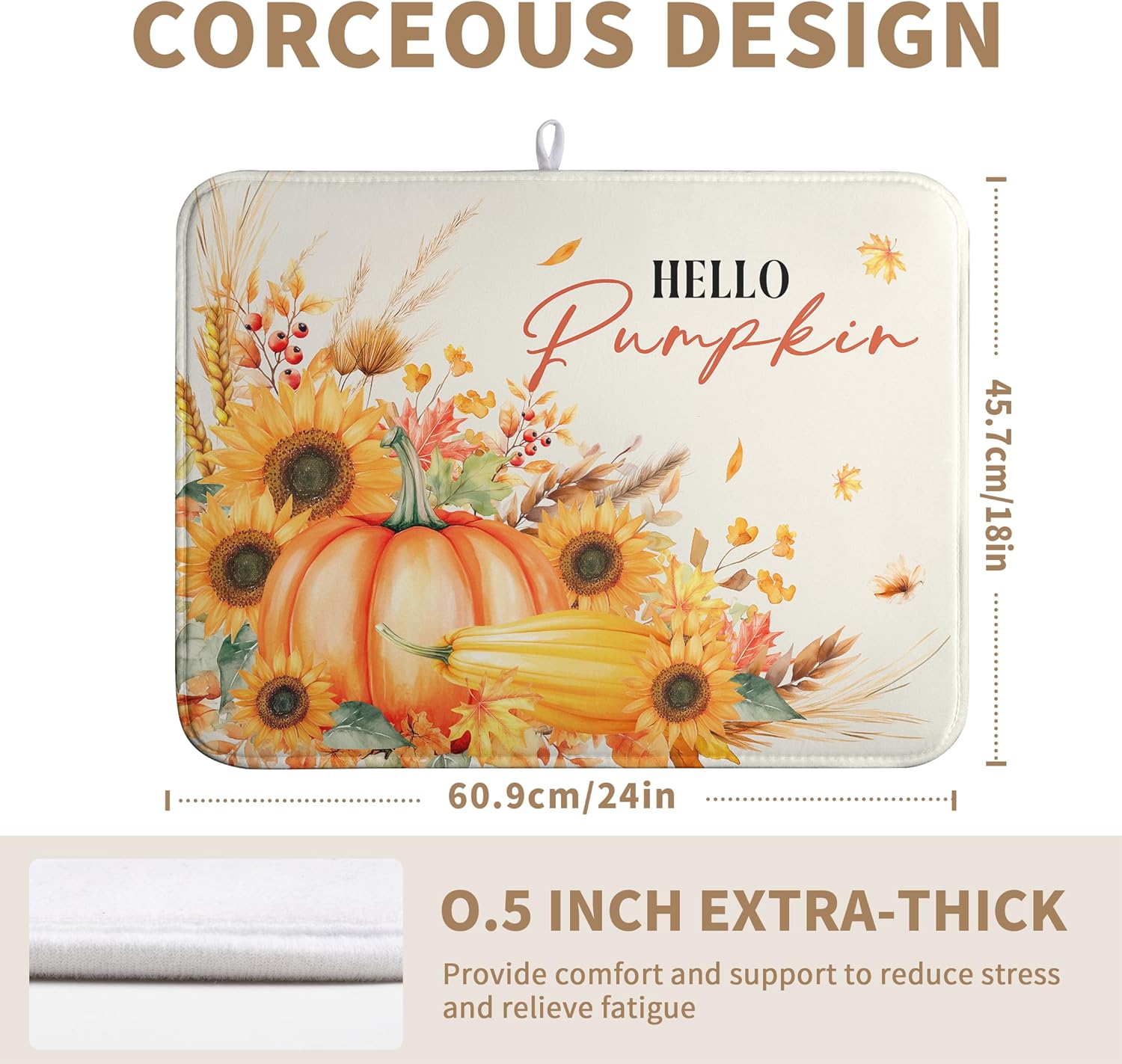 - [Material]: The surface of this Fall Pumpkin Harvest kitchen drying mat is made of absorbent microfiber and the middle is made of composite sponge. Thanksgiving Large microfiber dish drying mat can be easily rolled up and folded for storage or hanging.