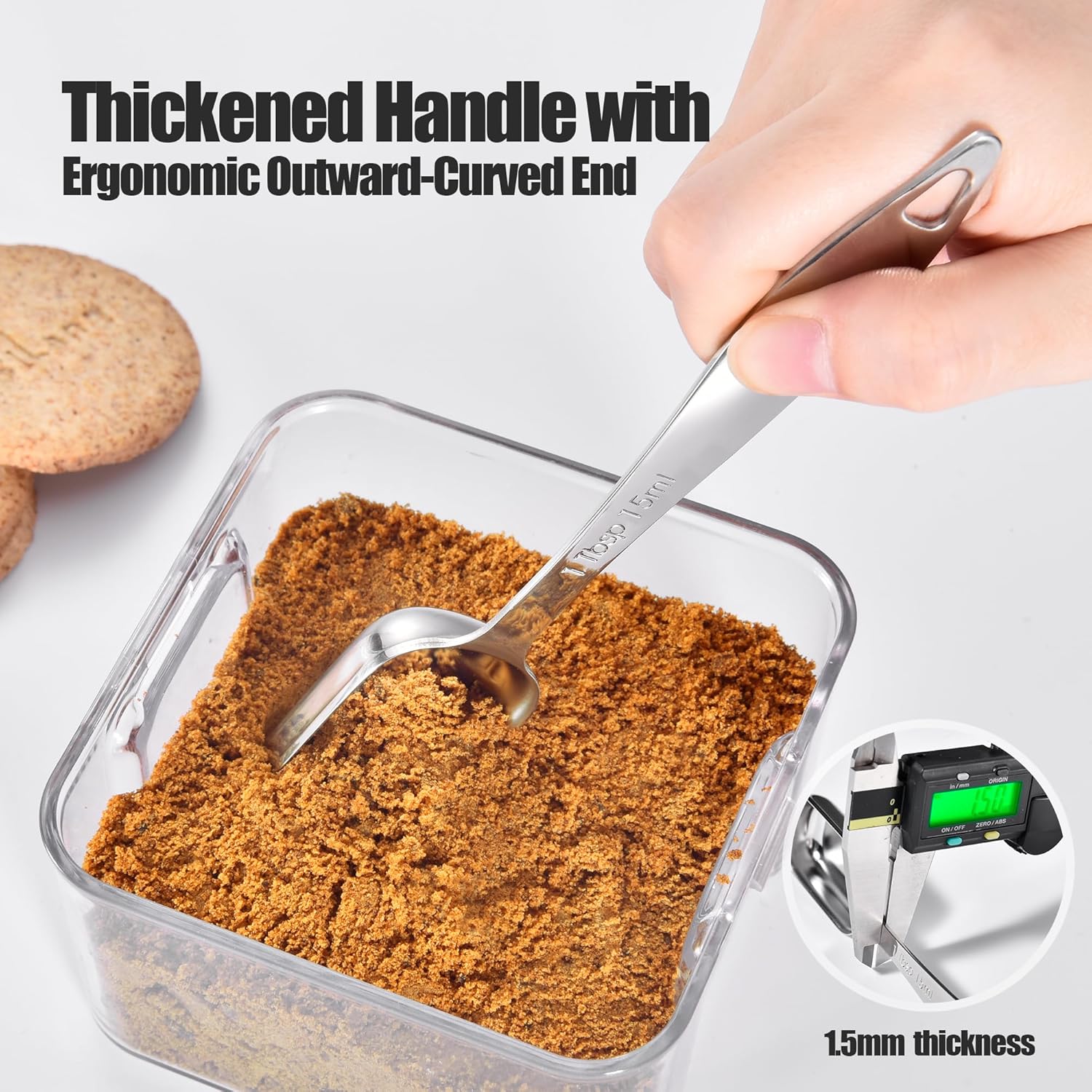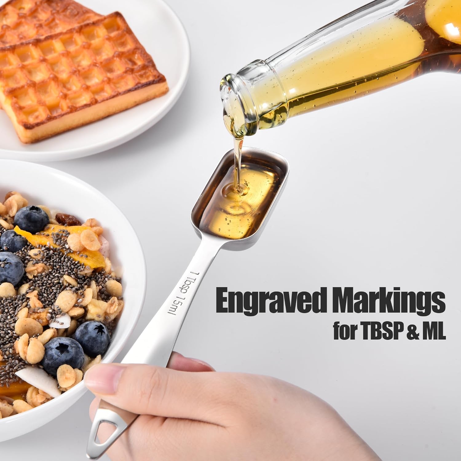 - Are measurements engraved or stamped on handles? The measurements are clearly engraved on each handle—not printed or stamped—so they won’t fade or wear off over time. Each teaspoon measuring spoon features both US & metric units (TBSP & ML) for easy and accurate measuring in any recipe. They’re also designed with smooth surface and rounded edges, with no risk of scratching your hands or other utensils. After use with sticky ingredients, you can simply rinse them off or pop in the dishwasher.