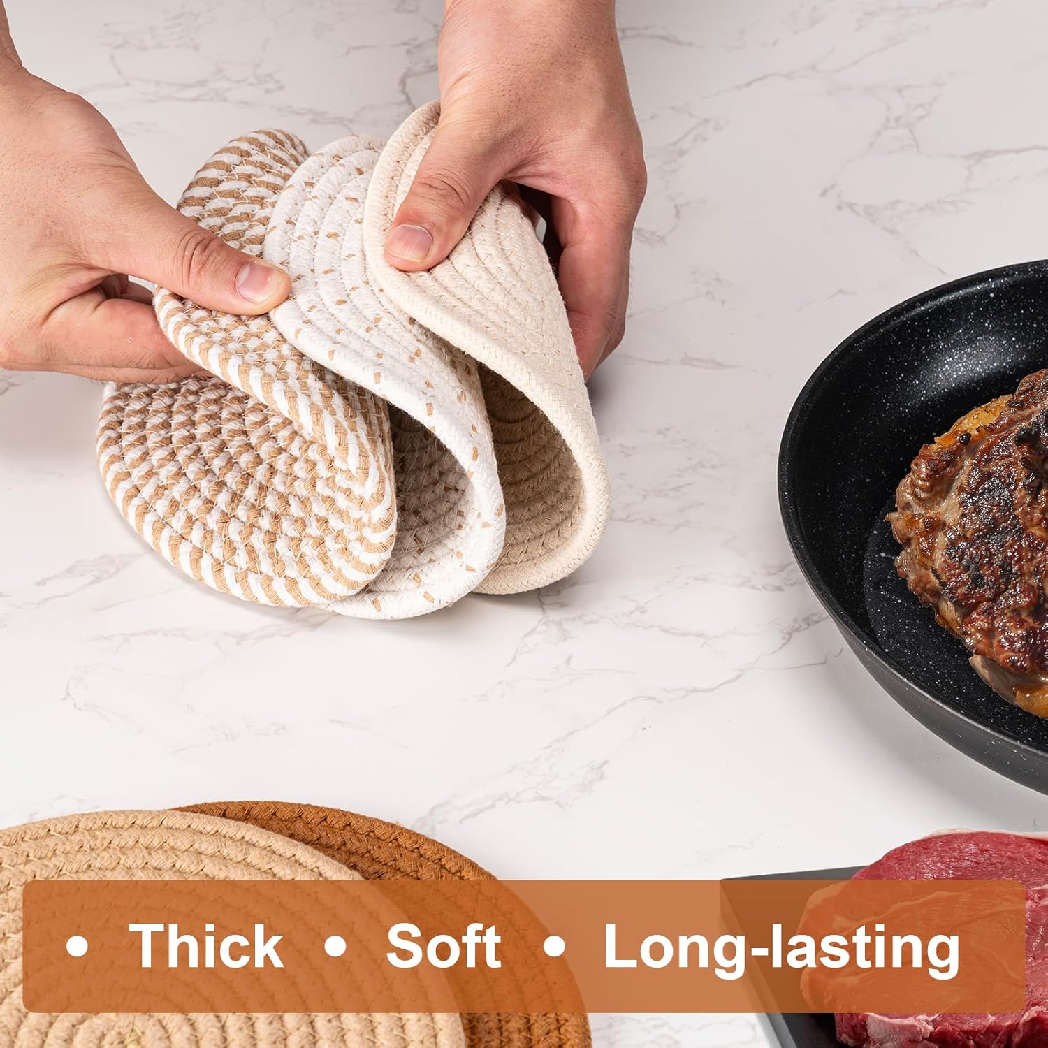 - Superior Functions: These hot pads for kitchen are made of eco-friendly cotton rope weaving, which are heat-resistant, soft, absorbent and non-slip. They effectively protect the tabletop from heat, scratches and stains, essential kitchen items.