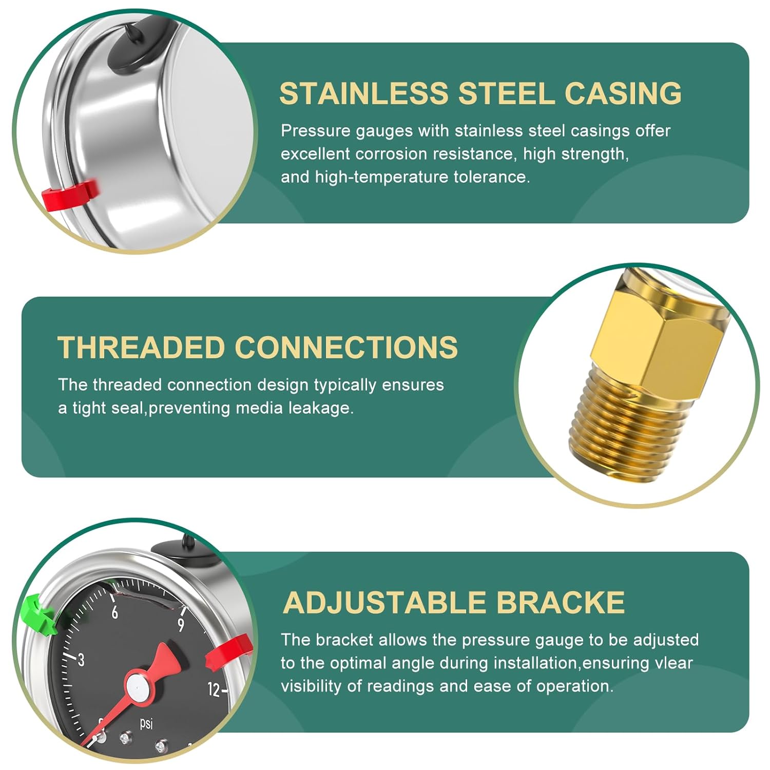 0-15PSI Stainless Steel Glycerin Filled Pressure Gauge 1.5" Black Dial Size, 1/8" NPT Back Mount, for Tube, Water Pump, Gas, Liquid, Pressure Test (with Range Mark Pointer)