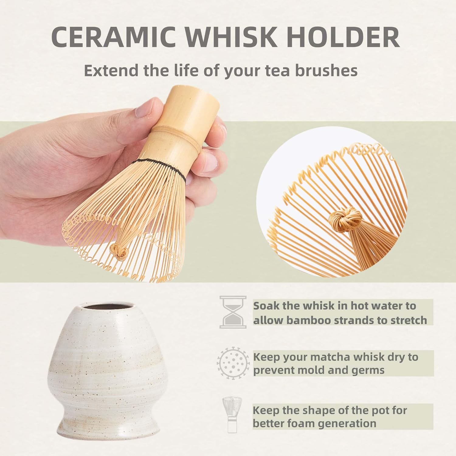 - 【Taste Delicious without Bitterness】Using bamboo matcha whisk and bamboo spoon and traditional spooncan give you a unique taste. Unlike electric mixers, bamboo whisk for matcha tea allow you to taste delicious without bitterness.