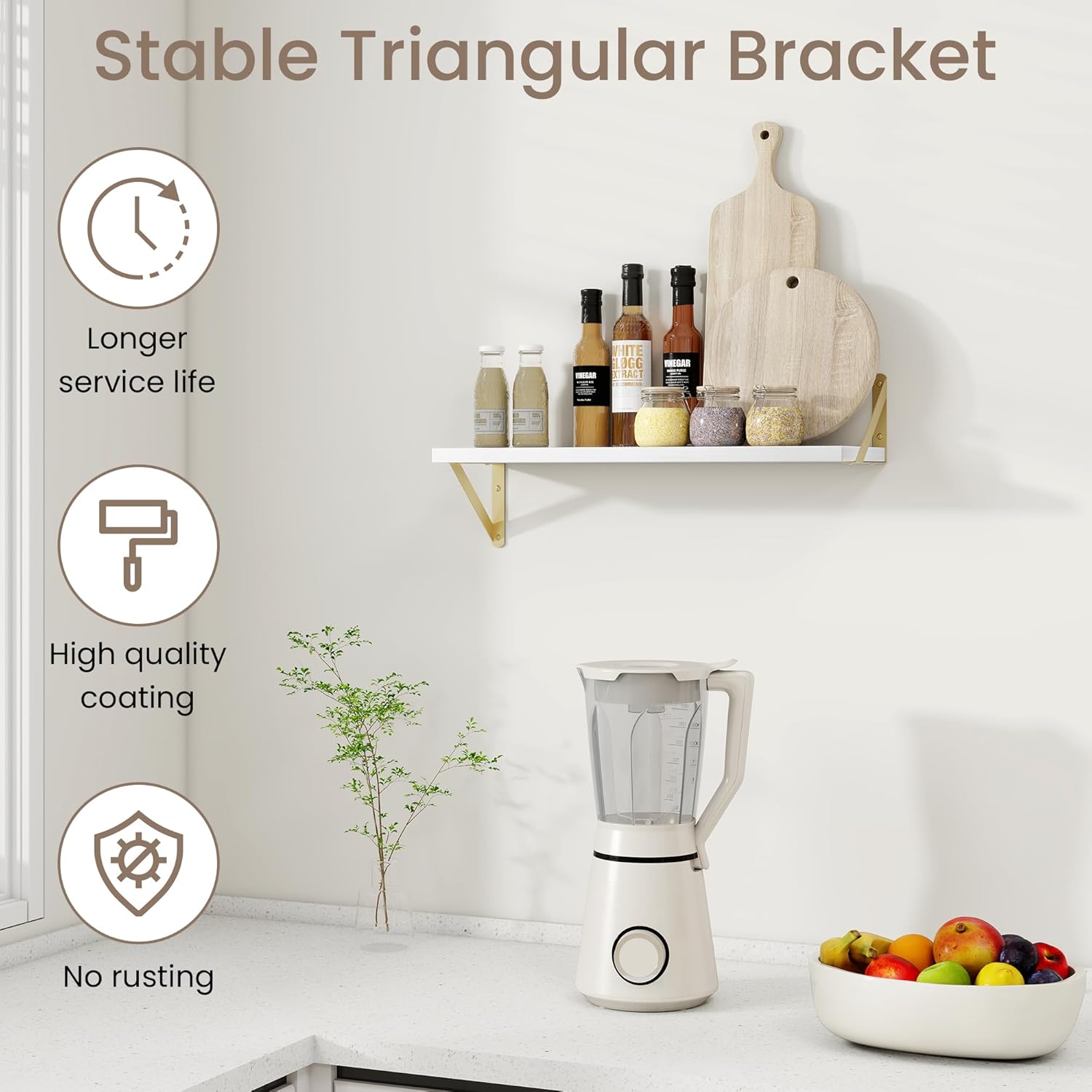 Deep Floating Shelves for Wall, 24W x 8D Wall Mounted Shelves Set of 2, Wide Display Ledge Shelf with Sturdy Metal Brackets for Living Room, Bathroom, Bedroom and Kitchen, White with Gold Brackets