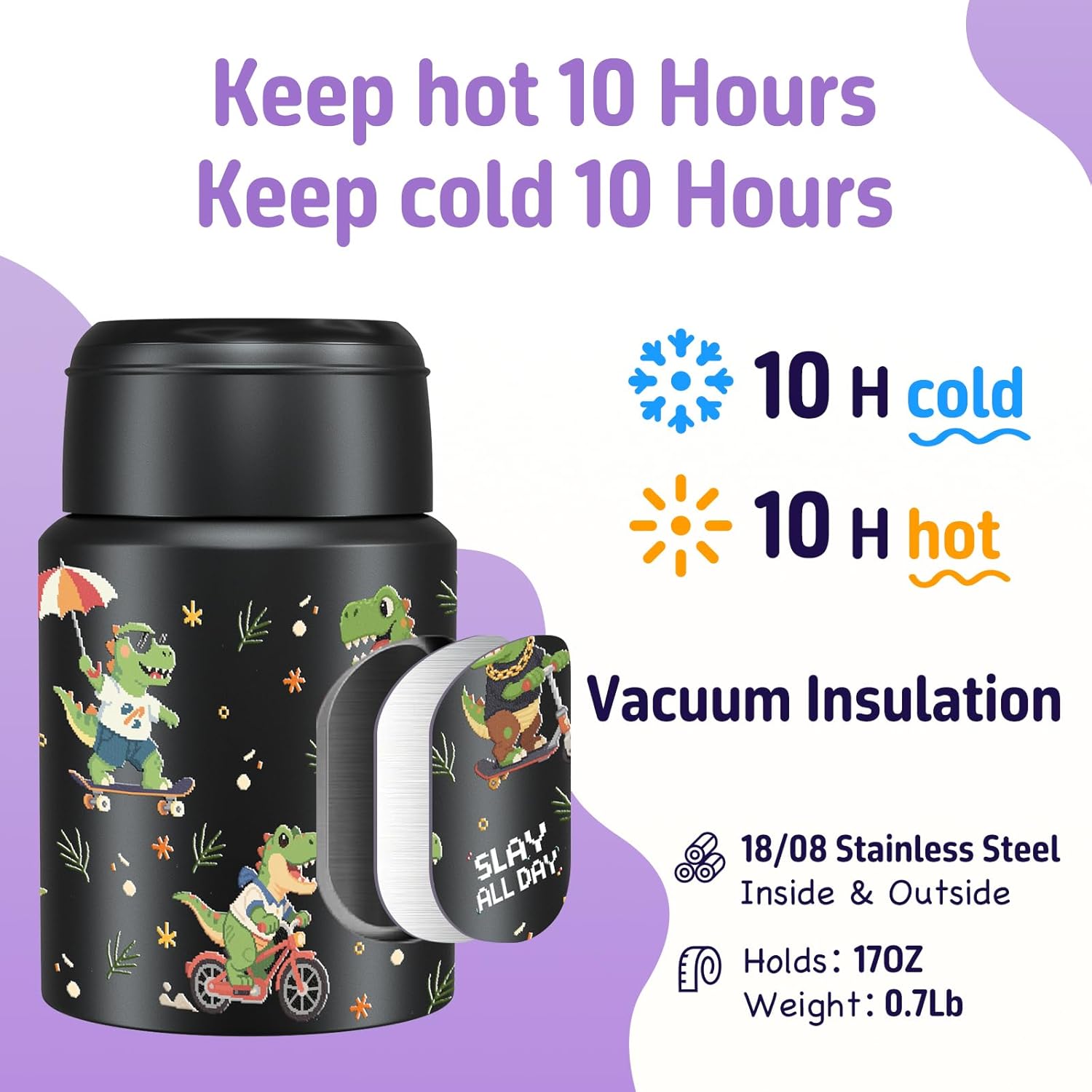 - ăTemperature holding timeăVacuum-insulated technology keeps soups, meals, and drinks HOT FOR 10 HOURS and COLD FOR 10 HOURS. Ideal for outdoor activities, office meals, or long commutes. Preheat/pre-cool with hot/ice water for 5-10 mins to maximize performance.