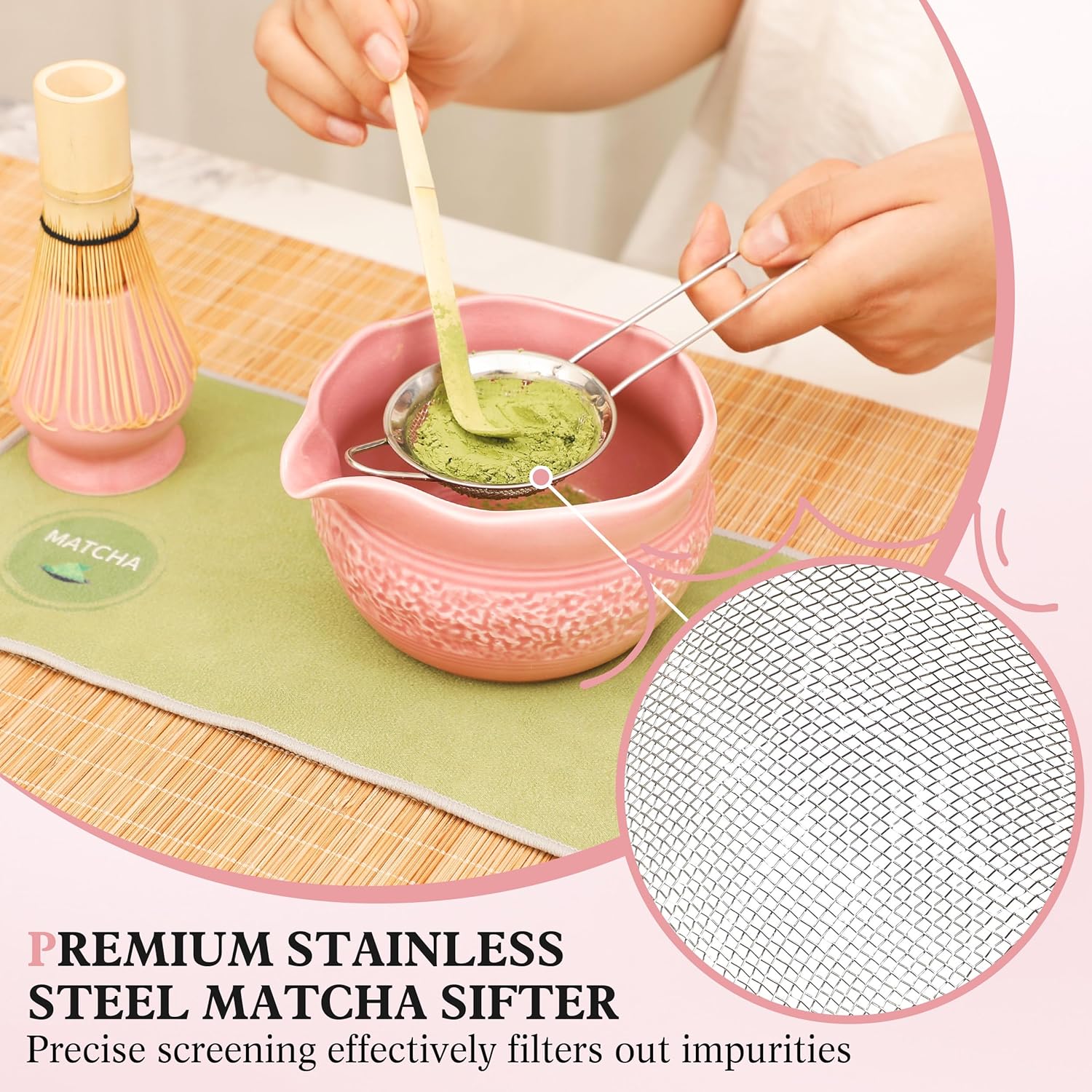 Matcha Whisk Set, Pink Matcha Set, 8 Pcs Complete Ceramic Matcha Making Kit with Bowl, Bamboo Whisk & Holder, Stainless Sifter, Tea Towel, Scoop & Scoop Rest, Perfect for Beginners & Lovers