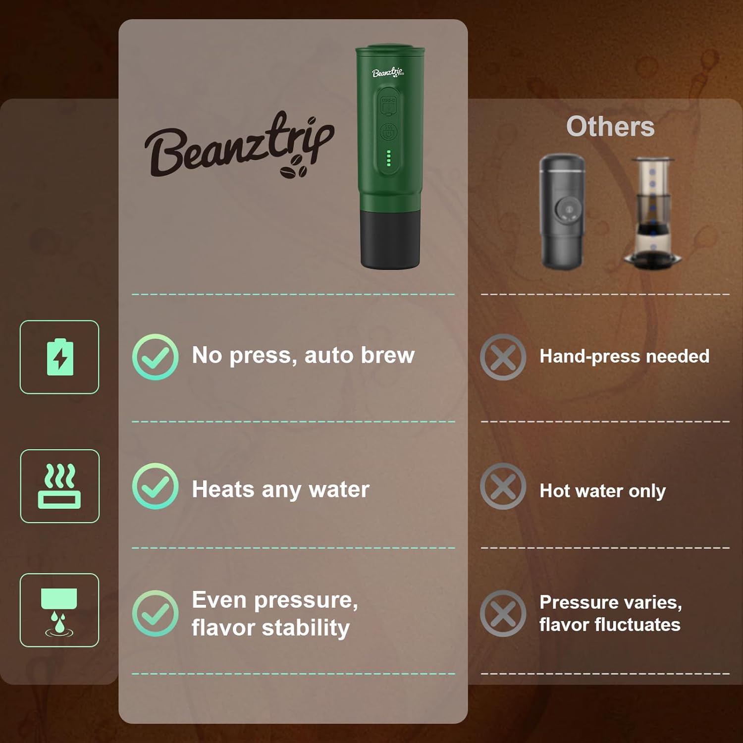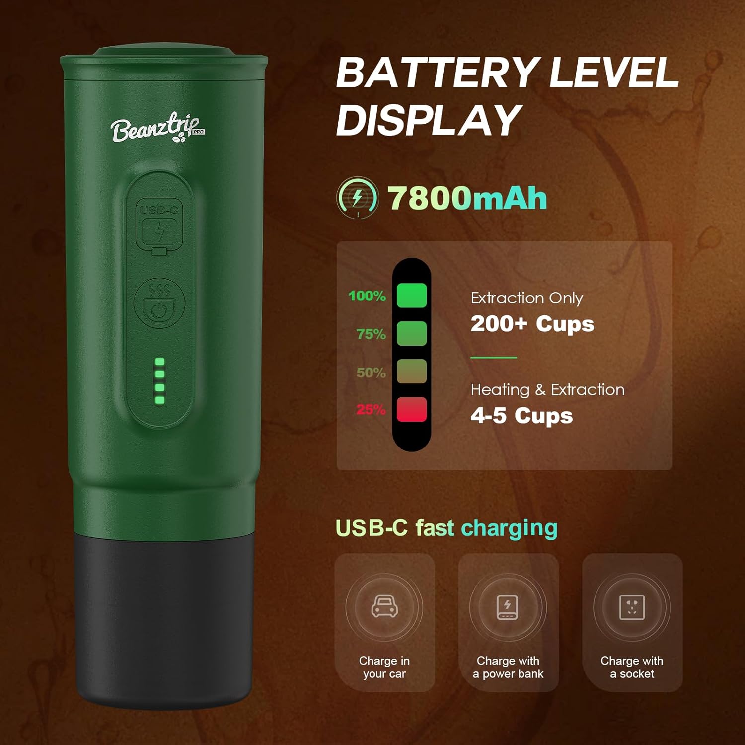 - ăExtended Battery Lifeă200+ cups per charge - engineered for outdoor! The high-capacity battery heats water for 200+ cups (pre-heated) or 4-5 full brew cycles (from cold to hot). BeanzTrip travel coffee maker is suatible for multi-day trips without power sources