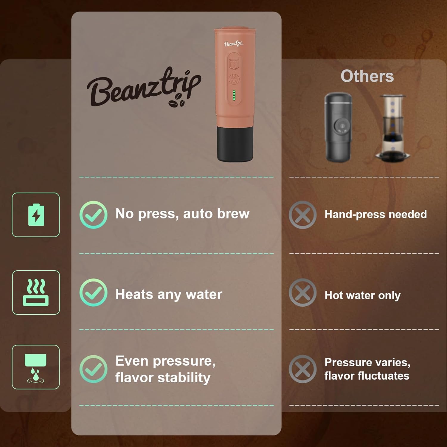 - ăExtended Battery Lifeă200+ cups per charge - engineered for outdoor! The high-capacity battery heats water for 200+ cups (pre-heated) or 4-5 full brew cycles (from cold to hot). BeanzTrip travel coffee maker is suatible for multi-day trips without power sources