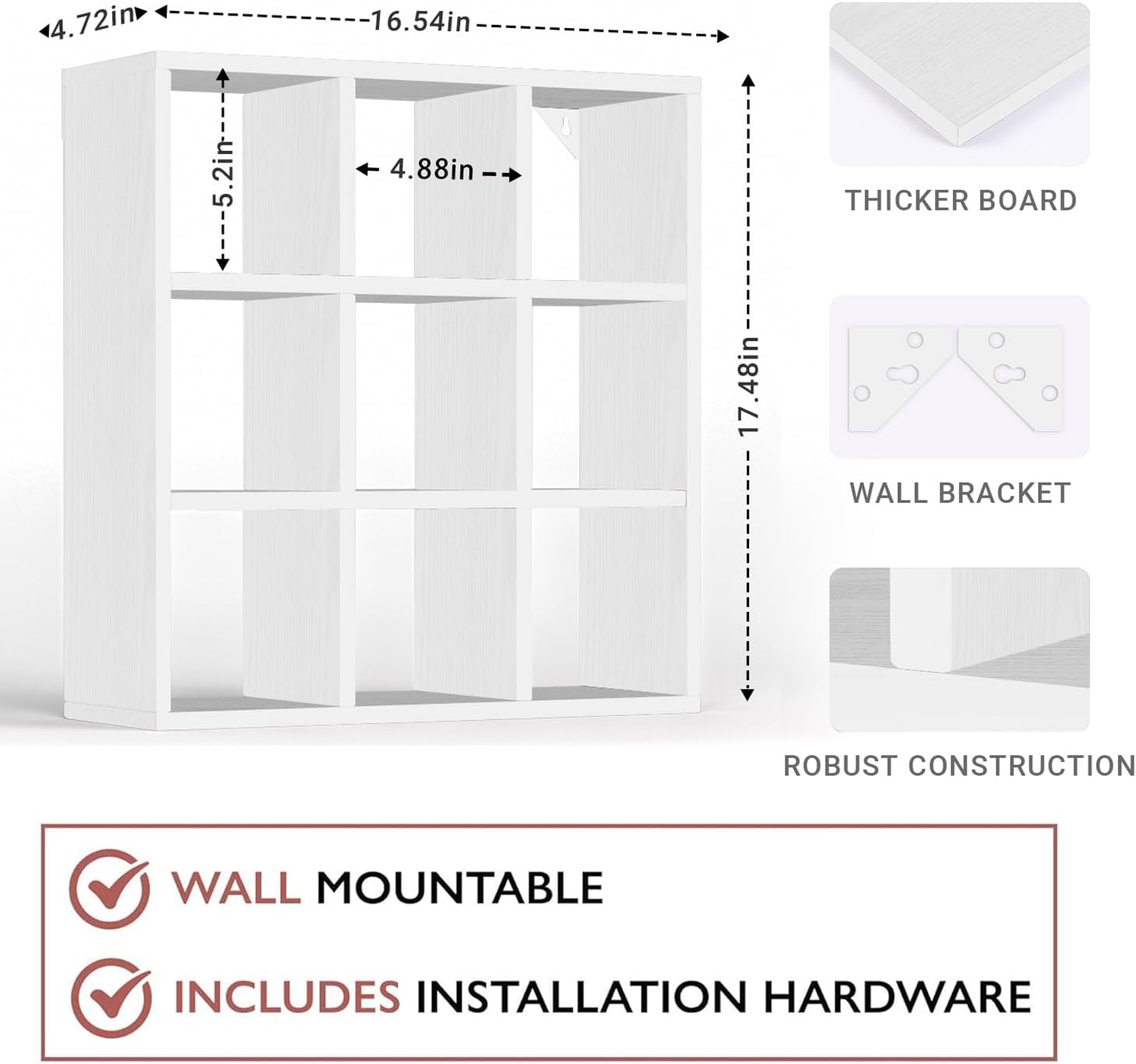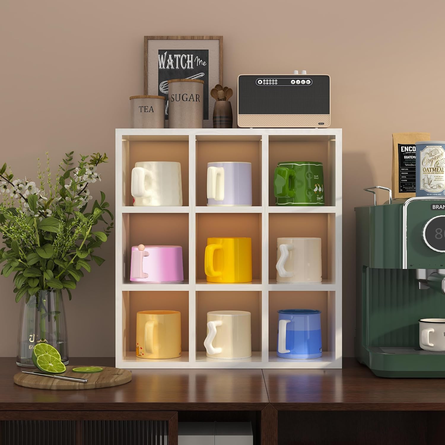 - ăHigh-quality and SizeăOur each coffee mug cabinet is carefully handcrafted, promising attention to detail and premium finishes. This finely crafted mug holder doesn't only serve a purpose but also adds a touch of artisanal craftsmanship and uniqueness to your home decor; The coffee mug rack's dimensions are 16.5x 17.5x 4.7 inches, Each grid size:4.8x 5x 4.7 inches, it can efficiently store up to 9 coffee mugs, ensuring the longevity of your beloved mugs.