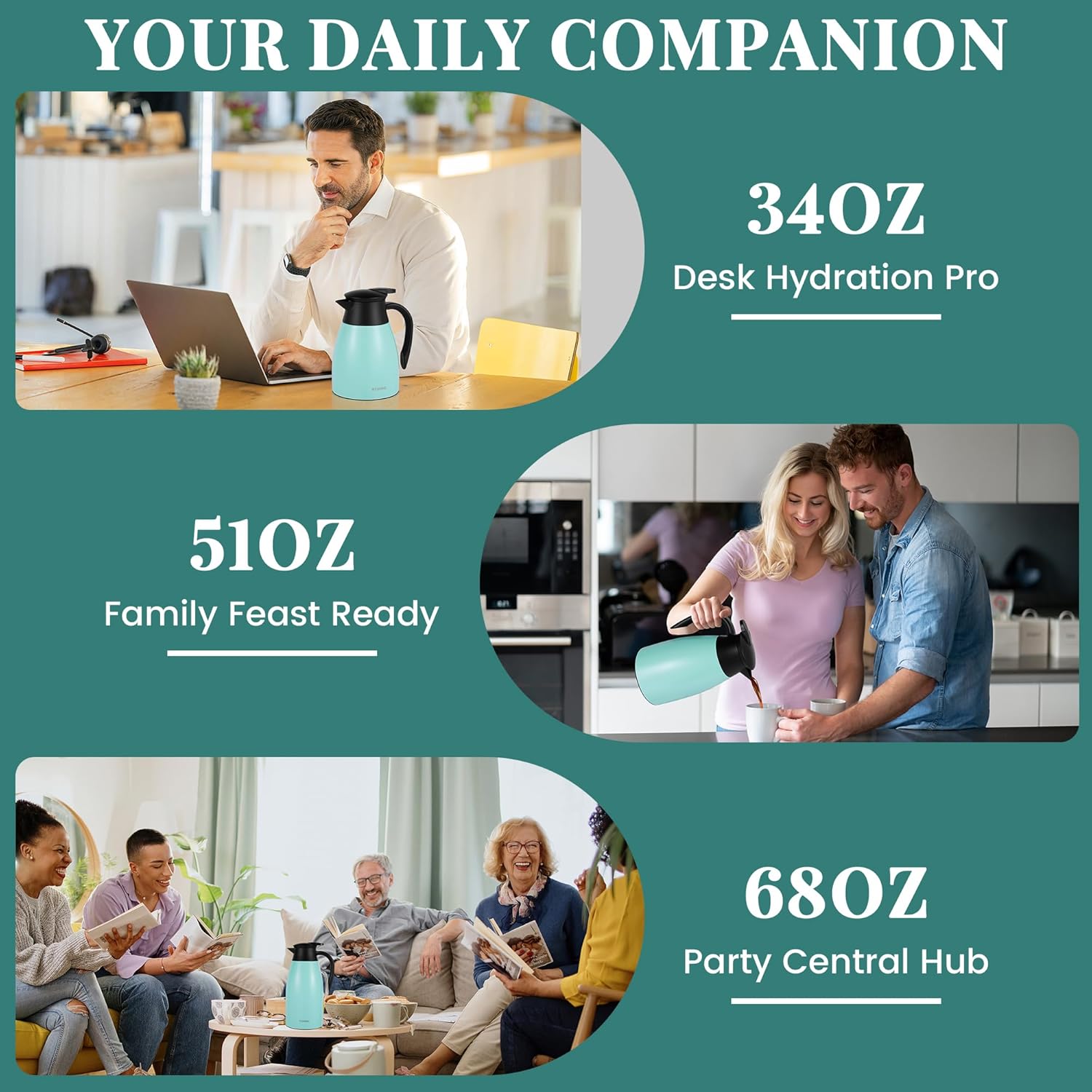 - Versatile & User-Friendly:Large coffee carafe (51 oz / 1.5 L) suits gatherings/offices. Pre-heat/pre-chill to keep coffee hot/cold longer. Sleek iced coffee carafe & hot tea thermos in one