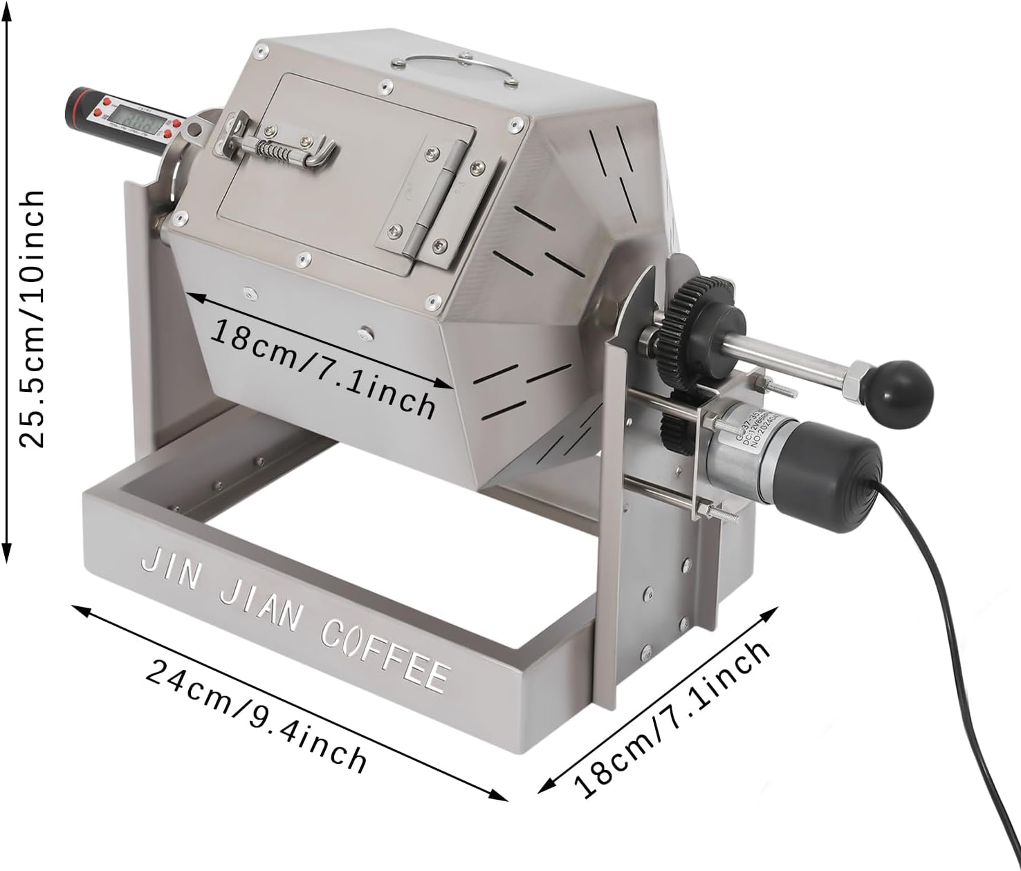 - 【Efficient Cooling System】The drum type roaster comes equipped with a cooling fan and 2 reusable filters (6-mesh & 40-mesh), enabling rapid and effective cooling of coffee beans and other nuts - significantly improving your coffee production efficiency. The included thermometer allows real-time temperature monitoring, helping you precisely control heat levels and prevent over-roasting
