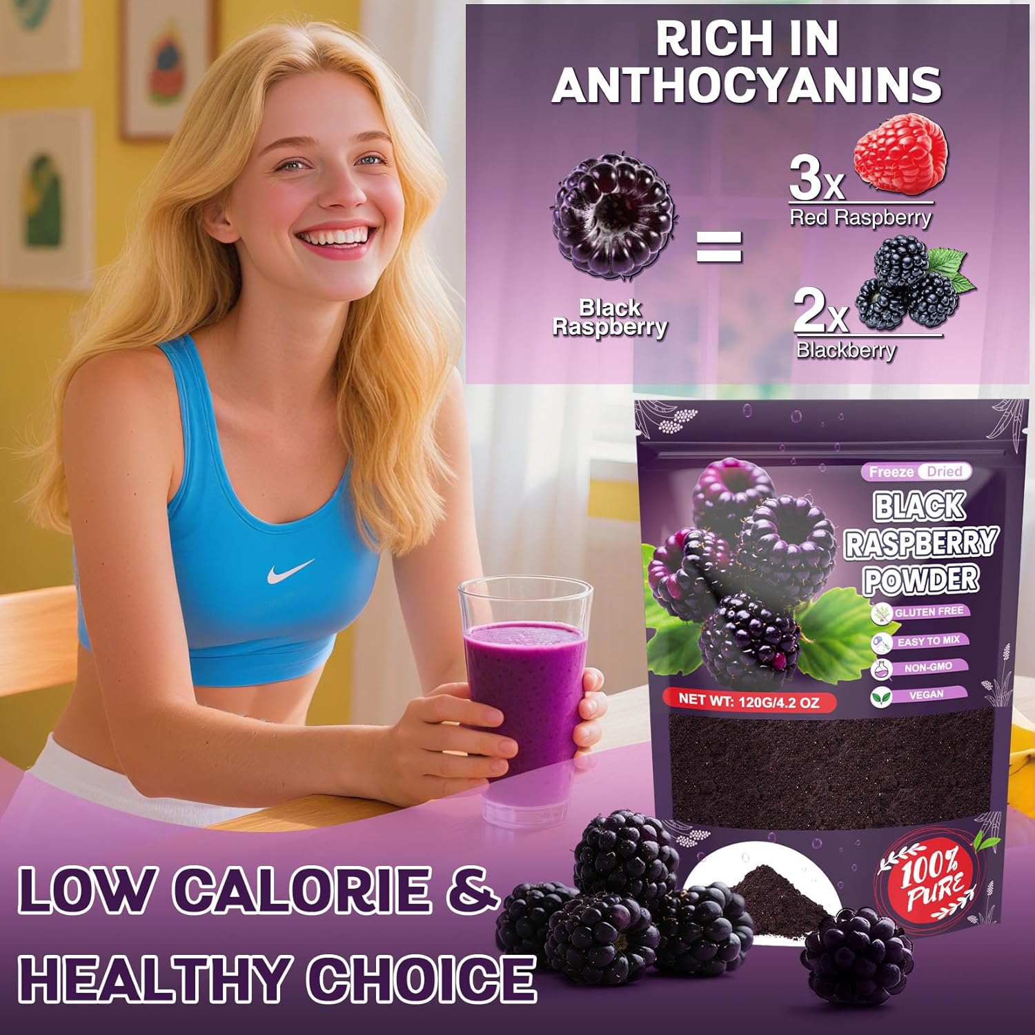 - PURE BLACK RASPBERRY FLAVOR - Our freeze dried black raspberry powder locks in more than 97% of the nutrients of fresh black raspberries through freeze-drying technology, preserving the rich black raspberry flavor. Each scoop of freeze-dried black raspberry powder has the nutritional value of 10 fresh, plump black raspberries, rich in vitamins, anthocyanins, and dietary fiber to efficiently replenish your daily needs.