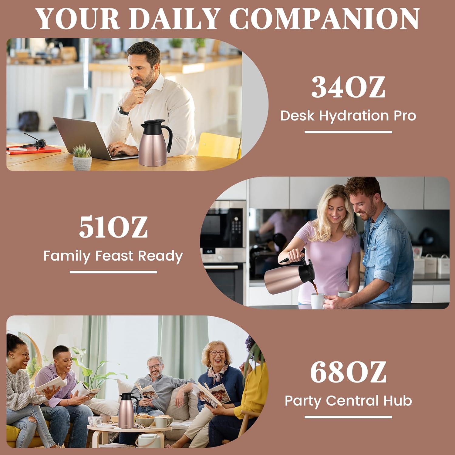 - Durable 304 Stainless Steel:Double-Stainless steel coffee carafe with double-walled 304 food-grade interior/exterior, odor-free. Non-slip base + scratch-resistant surface. Reusable thermos carafe for home/office