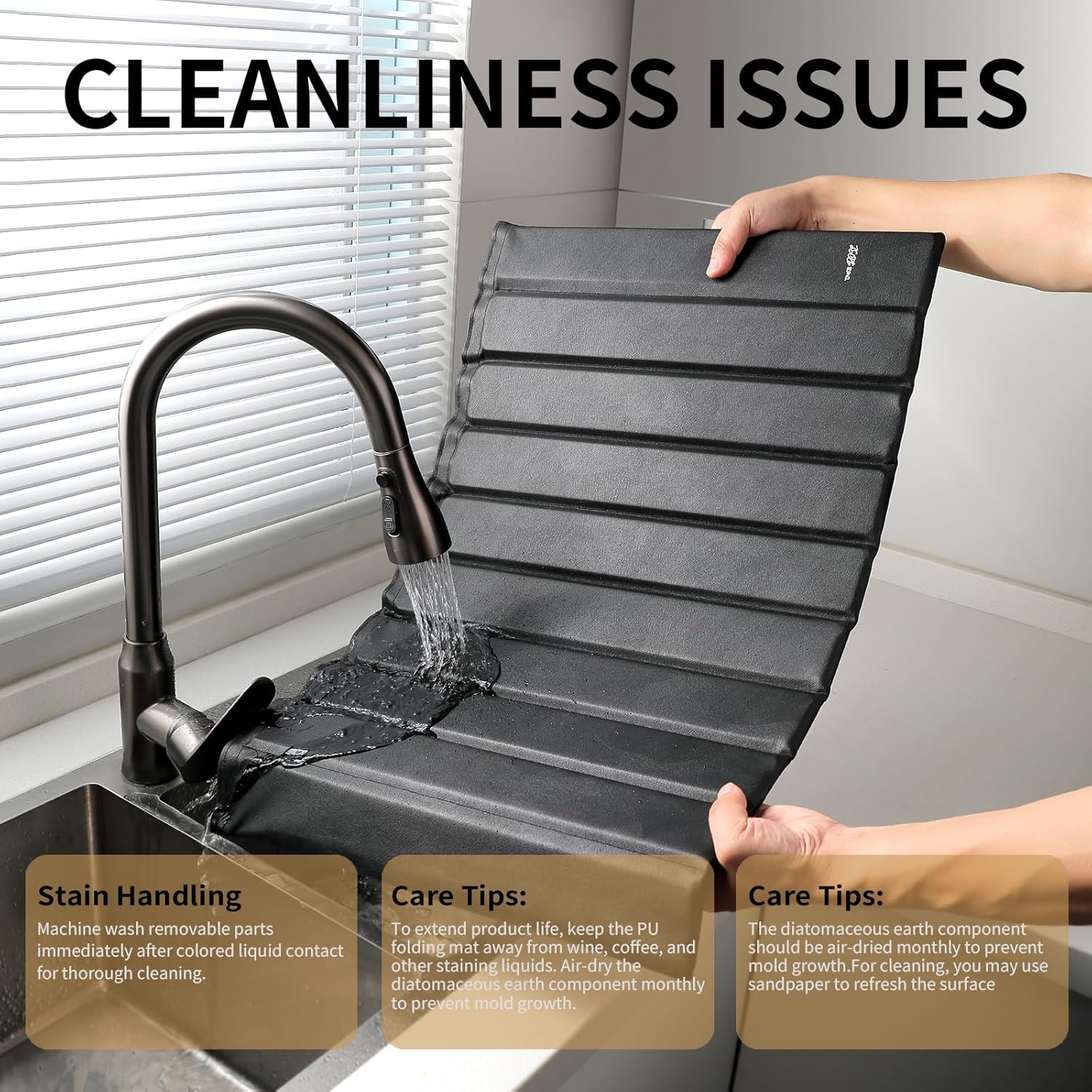 - 【EASY TO CLEAN AND MAINTAIN】If our dish drying mat accidentally gets stained, promptly putting it into the washing machine can help remove the stain. Let the diatomaceous earth mat air-dry in a well-ventilated area once a month.