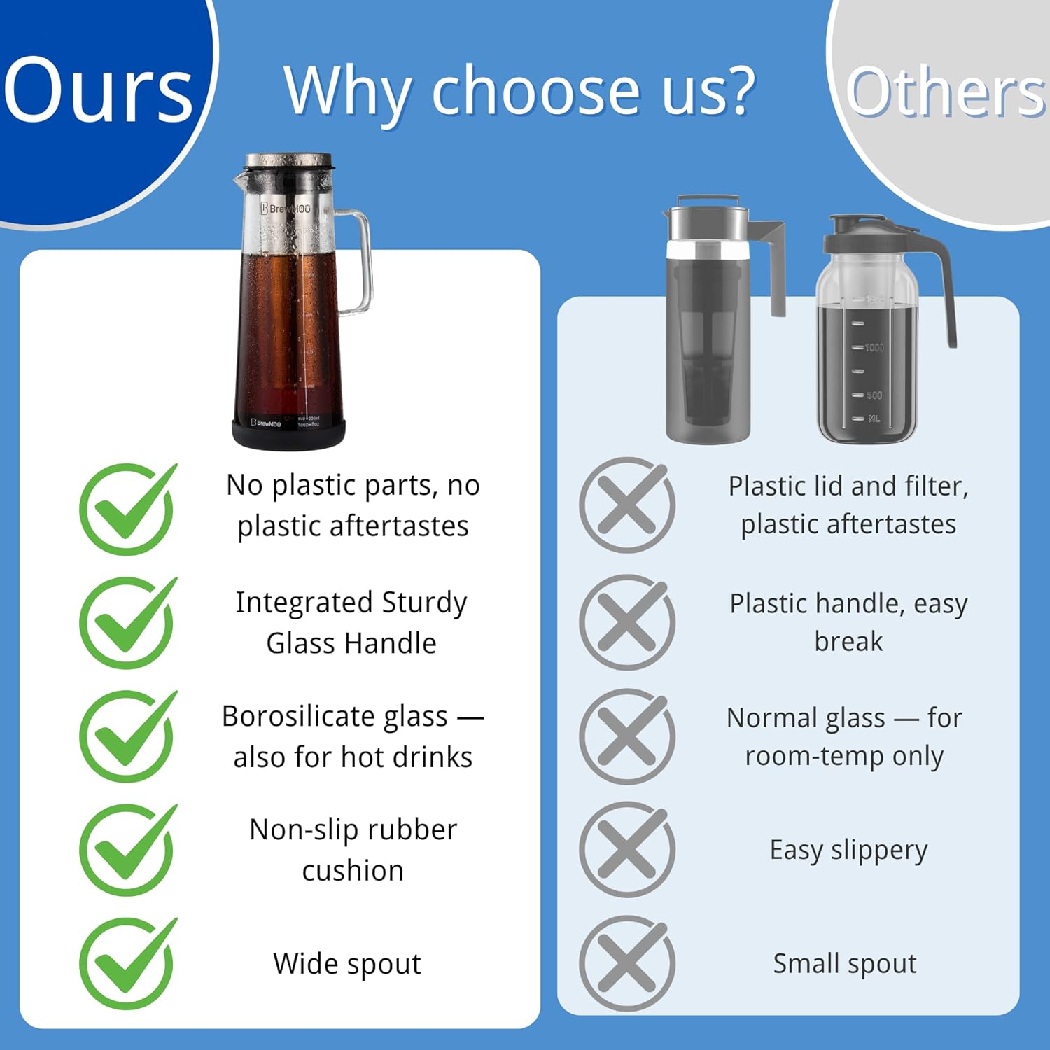 - [BREWMOO: BREW MOOD â SIMPLICITY MEETS PURE TASTE] BrewMOO, Brew Moodâcold brew should fit your rhythm, not disrupt it. Our Sleek Cold Brew Pitcher features a sleek tapered silhouette, sliding easily into tight spaces while adding a subtle touch of style to your kitchen. Made with borosilicate glass (durable, clear) and a 100um ultra-fine 304 stainless steel filter. We honor traditional cold brew (purest form) for an exceptional experience: silky-smooth sips, no plastic or chemical aftertastesâjust the full, rich flavor of your beans.