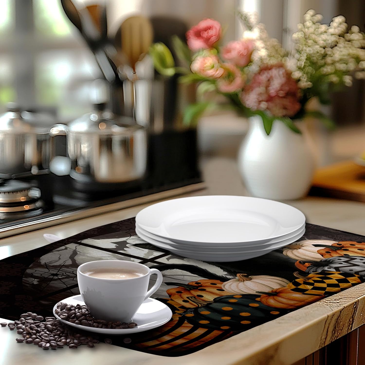 - [Multi-functional]: This Halloween Black Cat Pumpkins dish drying mat can be placed under the dish rack to collect dripping water to keep the counter dry and clean, or you can place bottles, pots, plates, bowls, cups and other utensils directly on the mat. Fall Pumpkin Rustic Large dish drying mat can also be placed under the coffee machine to absorb spilled coffee.