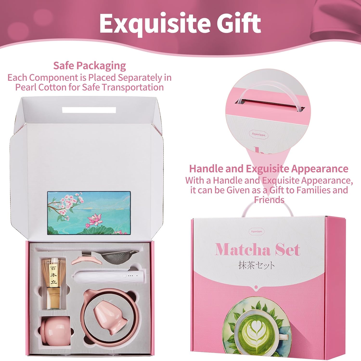 Matcha Whisk Set,9 Pcs Japanese Matcha Set Pink, Matcha Kit with Sifter, Matcha Tea Cloth, Matcha Powder Canister, Electric Rechargeable Frother(Pink)
