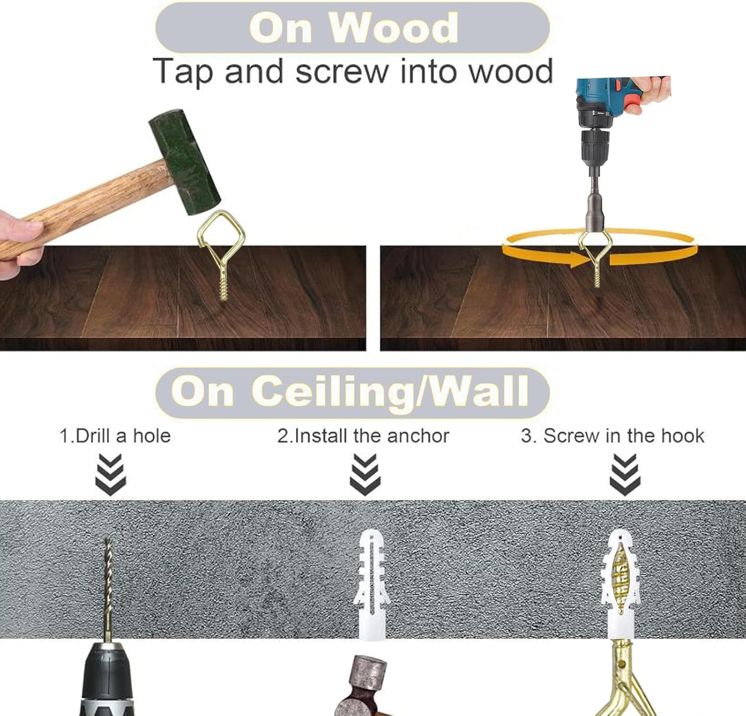 - đ§ăEasy Screw-In Installationă Simply twist into wood, ceilings, beams, fences, or walls for instant hanging support. 2.36-inch length provides a firm hold.
