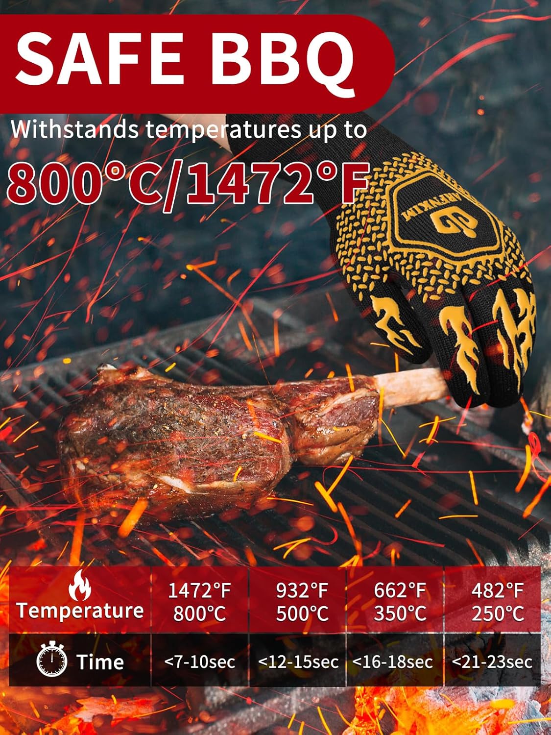 - Unmatched Heat Resistance: Our BBQ oven gloves are designed to 1472°F (800°C) withstand extreme heat, ensuring safe handling of hot grills, pans, and oven trays. Perfect for all your high-temperature cooking needs.