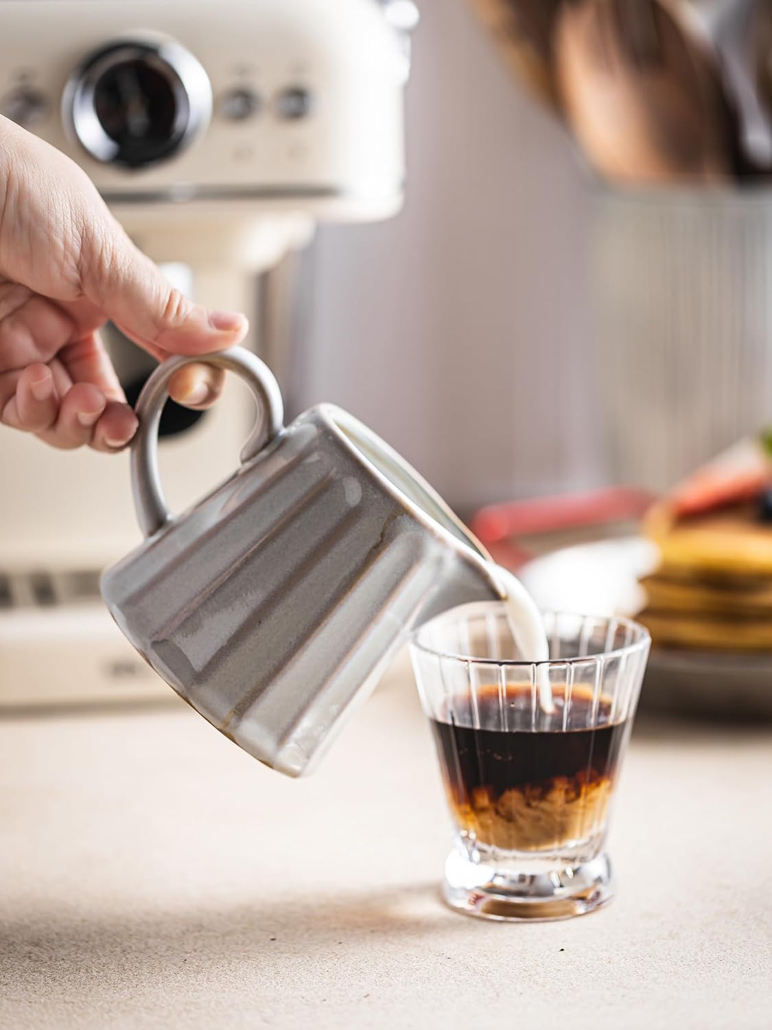 - Charming Striped Design: This ceramic milk pitcher features a vertical striped texture with a soft white glaze and rustic rim, adding a cozy, timeless touch that pairs beautifully with modern, farmhouse, or vintage table settings