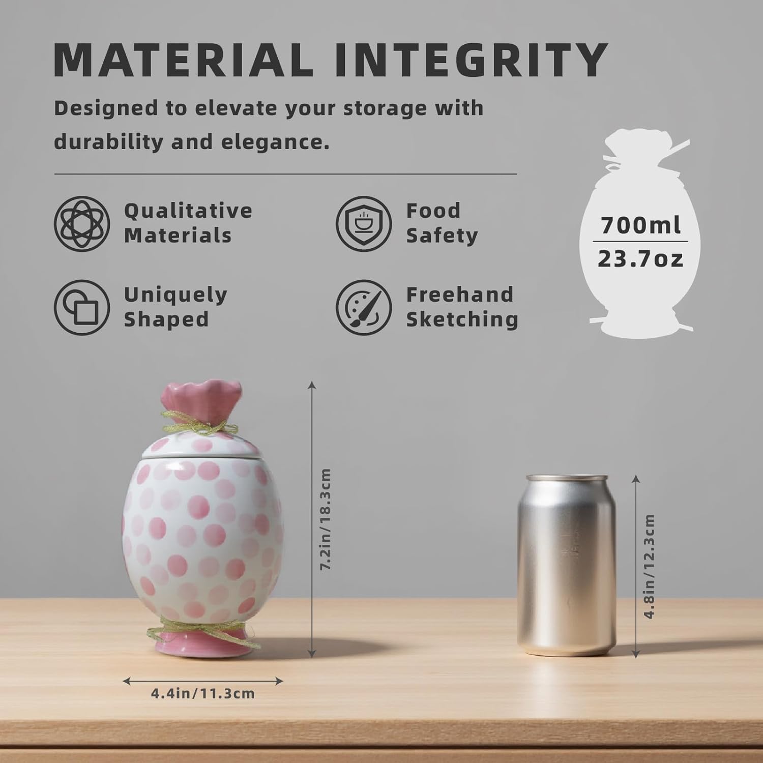 - 【Multifunctional Containers】----- This kitchen storage jars is 700 ml / 23.7 oz, to meet your various storage needs. Use the ceramic food storage containers for cookie, coffee beans, tea, spices, flour, sugar, brown sugar, dried grains, cereal, or dog treat. These jars can also serve a spen holder, small vases, and more.