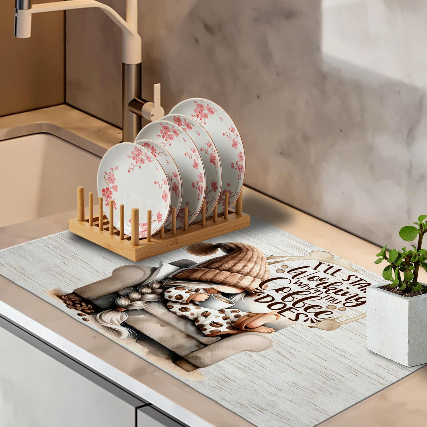 Espresso Lovers Gifts Dish Drying Mat, Funny Cute Gnome Girl Coffee Bar Mat for Countertops, Espresso Absorbent Dish Drying Mats for Kitchen Counter Coffee Maker, 16x24 Inch