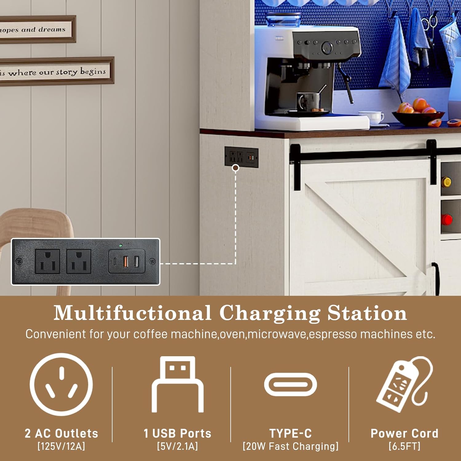 - ăConvenient Charging Socketsă The Coffee bar cabinets comes with a built-in power outlet, which features 2 AC plugs and 2 USB ports,1 type-c, powering up your essentials like ice-maker, coffee maker, wine fridge or microwave is a breeze. Elevate your space effortlessly â sip, relax, and enjoy!