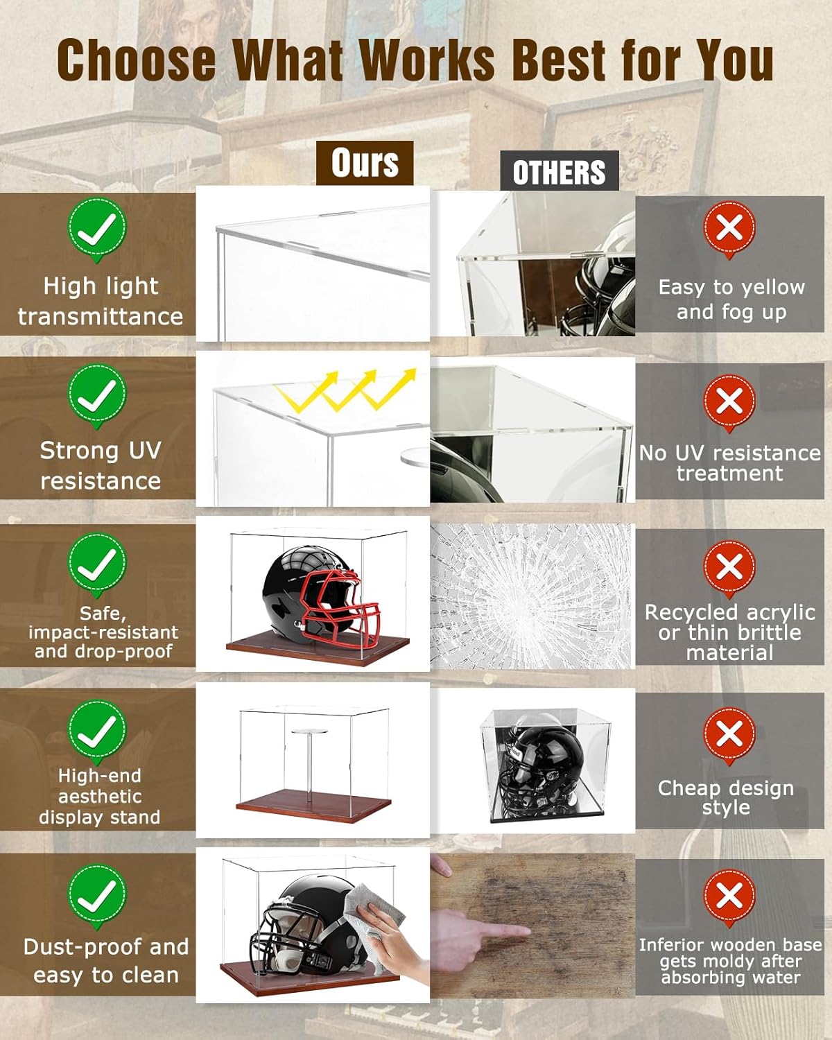 Full Size Football Helmet Display Case - 15.4×11×11.8in Interior, 100% Wooden Base, Compatible with Baseball/Motorcycle/Racing Helmets, High-Transparency Acrylic with UV Protection