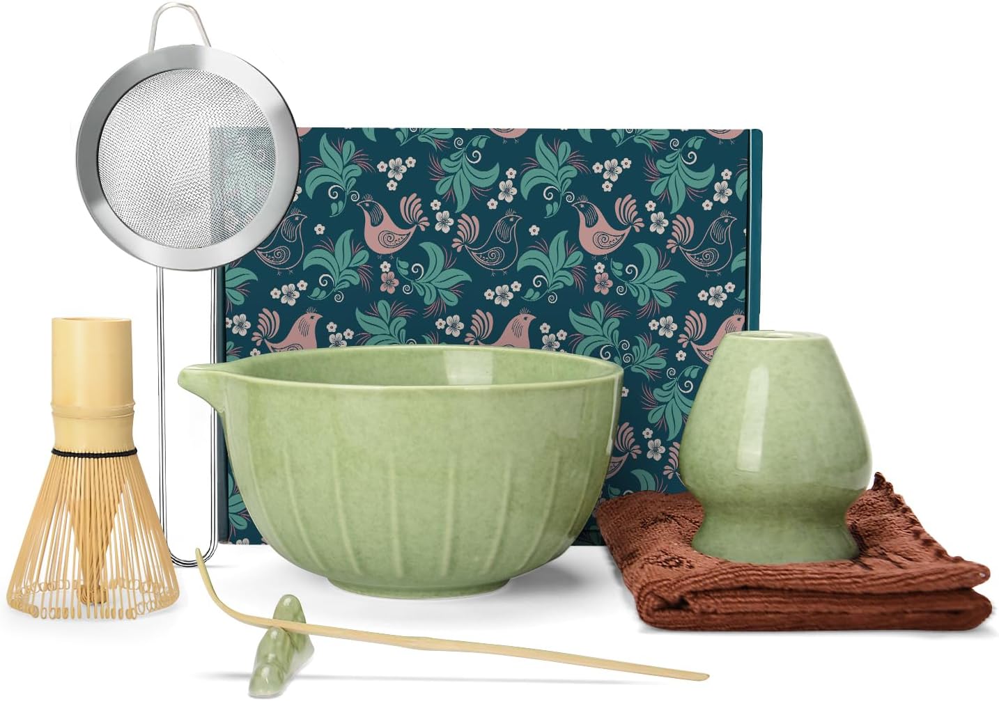- ✅7 PCS Matcha Kit: MONOJOY matcha kit includes 1 handcrafted bamboo matcha whisk, 1 natural bamboo scoop, 1 ceramic scoop rest, 1 stainless steel sifter, 1 ceramic matcha bowl - capacity of 18.5 oz, 1 ceramic whisk holder, 1 tea towel. Each piece is meticulously crafted, enabling you to effortlessly create a refined matcha ritual in the comfort of your home