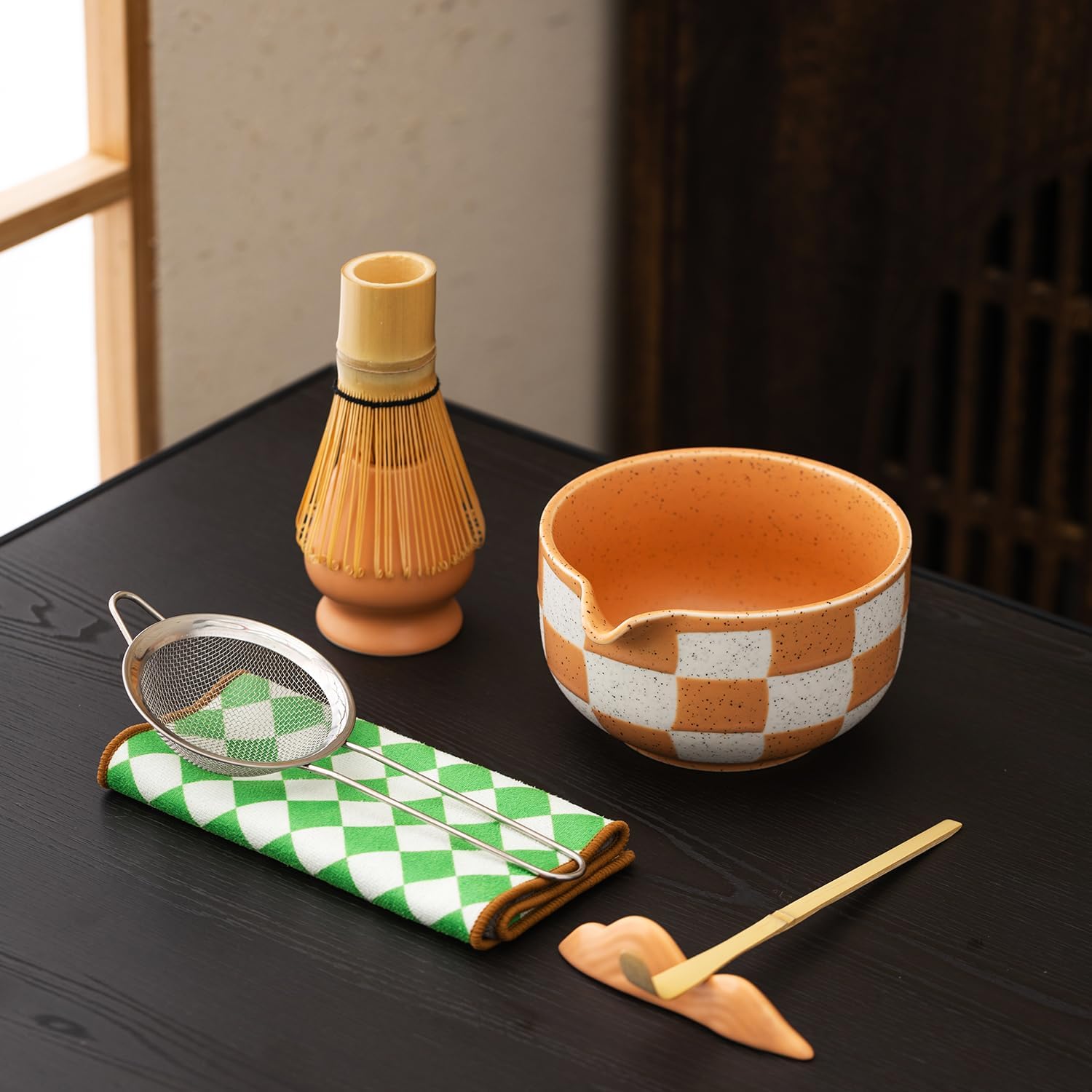 Premium 7-Piece Matcha Tea Set – Traditional Japanese Style with Elegant Grid Pattern, Includes Bamboo Whisk, Ceramic Bowl, Scoop & More – Perfect for Matcha Lovers & Tea Ceremony (Orange grid)
