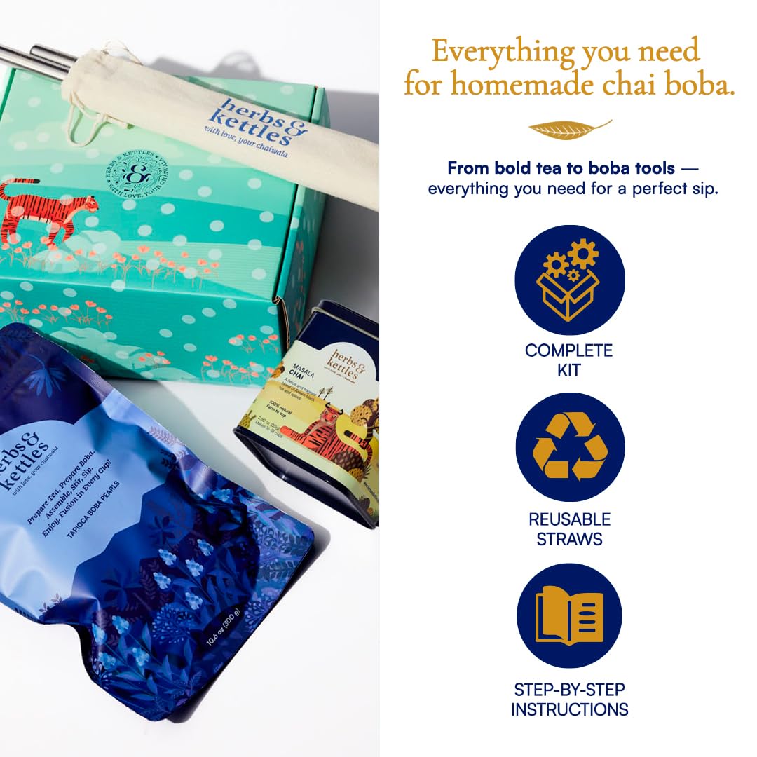 Herbs & Kettles Masala Chai Boba Kit | Assam Black Tea with Ginger, Cardamom, Cinnamon, Cloves & Black Pepper + Chewy Tapioca Pearls | DIY Bubble Tea Kit with Reusable Straws & Easy Instructions