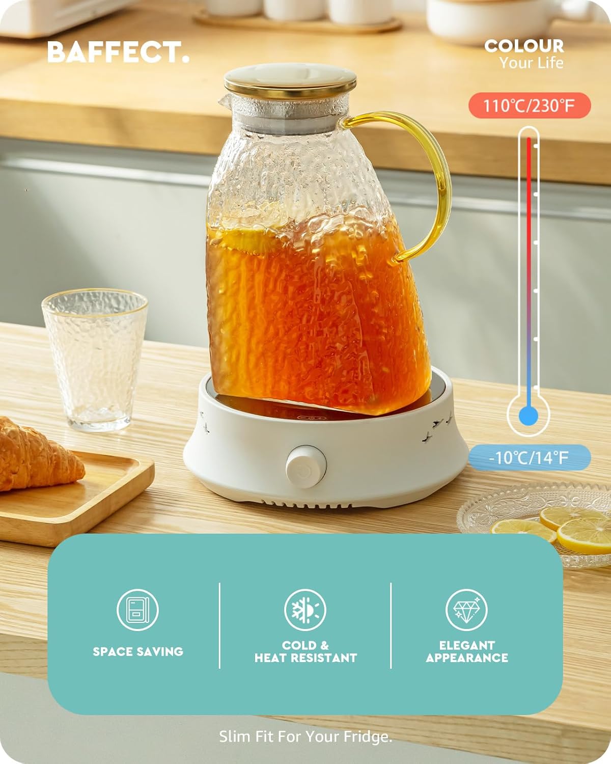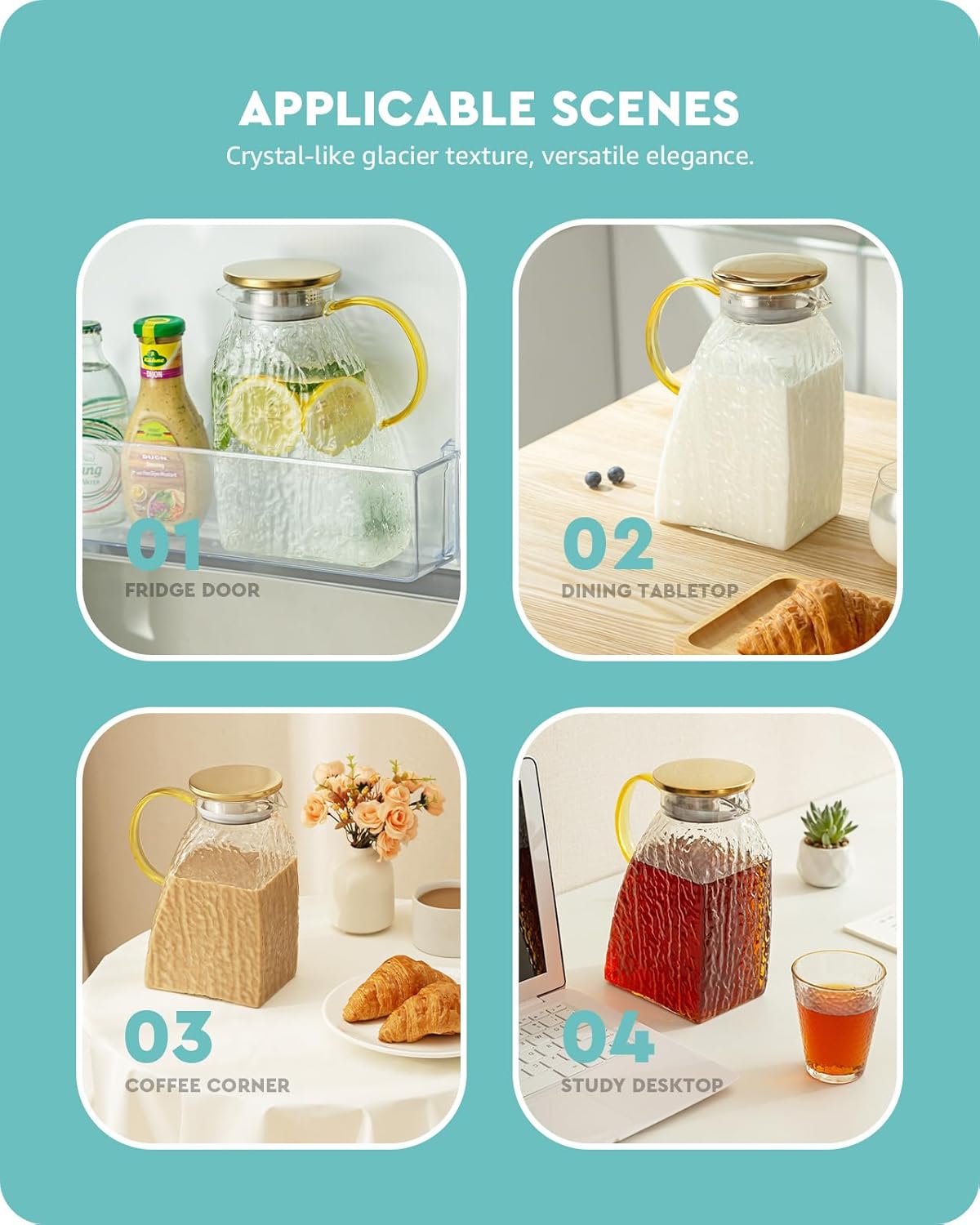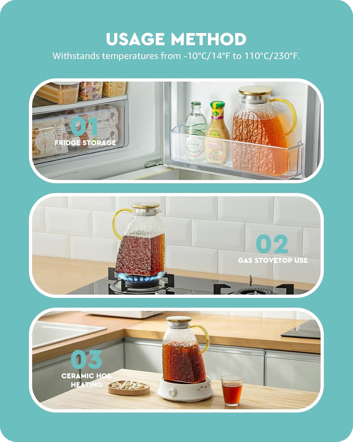 - COLD & THERMAL SHOCK - Crafted from high borosilicate glass, this glass water pitcher for fridge withstands sudden temperature shifts from -10°C/14°F (fridge) to 110°C/230°F (gas/ceramic cooktops), making it ideal for brewing iced tea, coffee, lemonade, soda, juice, sangria, cocktails, or milk drinks