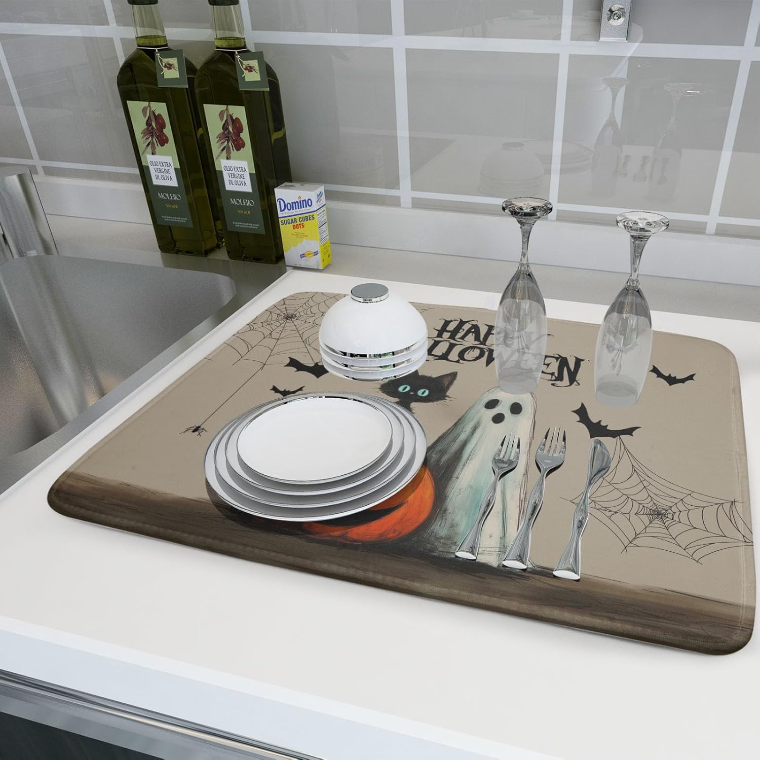 Happy Halloween Black Cat Ghost Dish Drying Mat for Kitchen Counter,Halloween Pumpkin Spiderweb Bat Drying Mat 18 x 24 Inch with High Absorbent Microfiber Drainer Mat for Coffee Bar