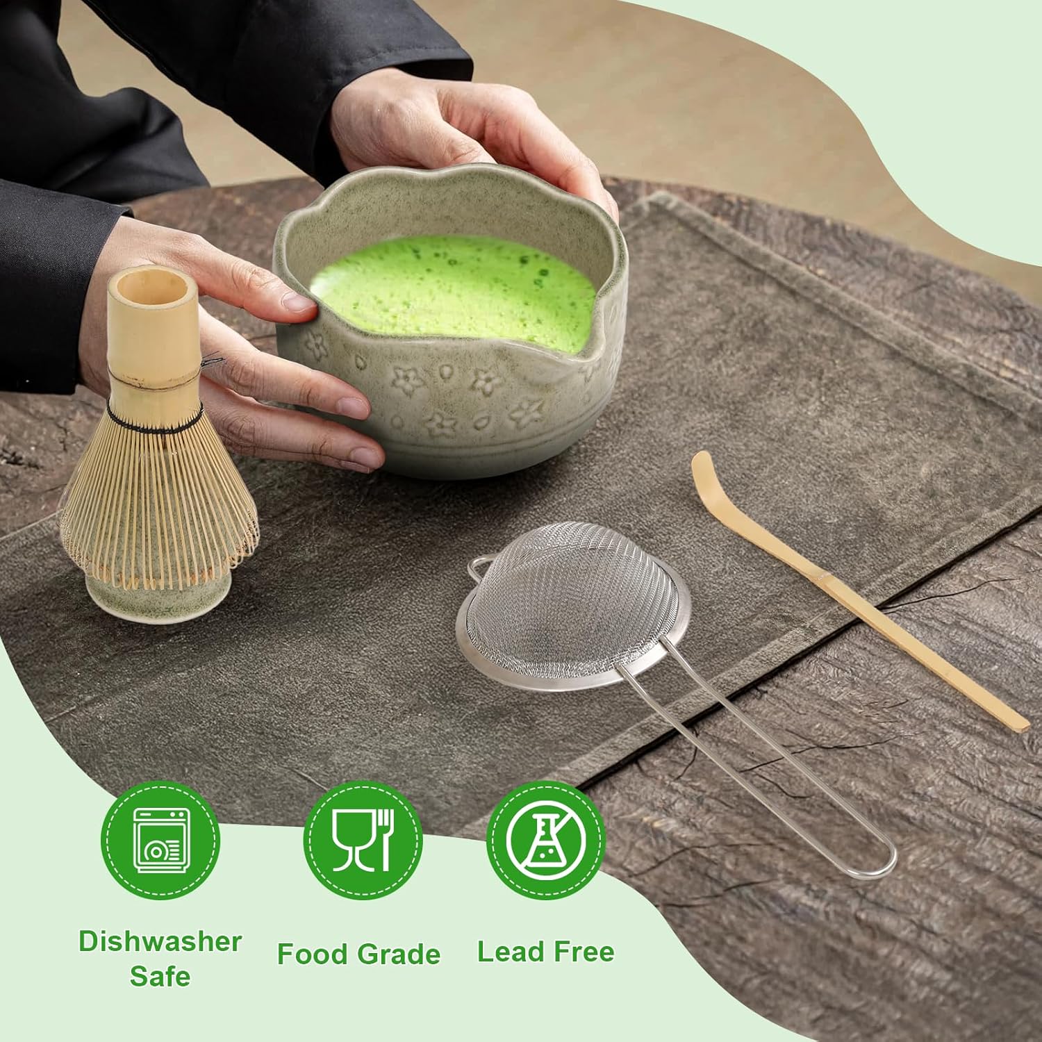- ✅ Professional Matcha Preparation Set – Everything you need in one kit: Bamboo whisk (Chasen), bamboo scoop (Chashaku), stainless steel sifter, ceramic matcha bowl (Chawan), and whisk holder for authentic Japanese tea ceremony or daily use.