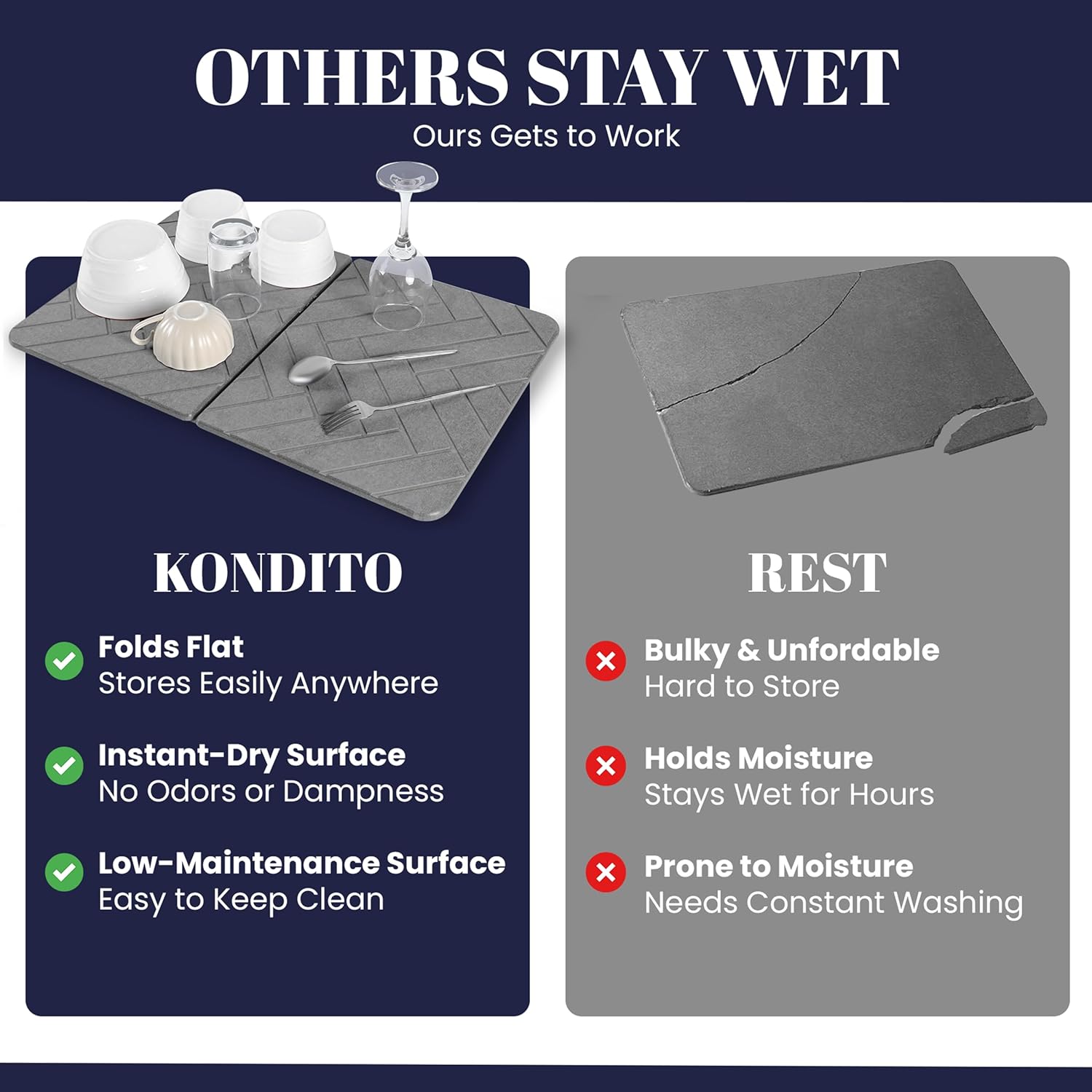 - [SPACE-SAVING FOLDABLE DESIGN] This large stone dish drying mat for kitchen counter folds completely flat for easy storage in any drawer or cabinet, freeing up precious counter space when not in use.