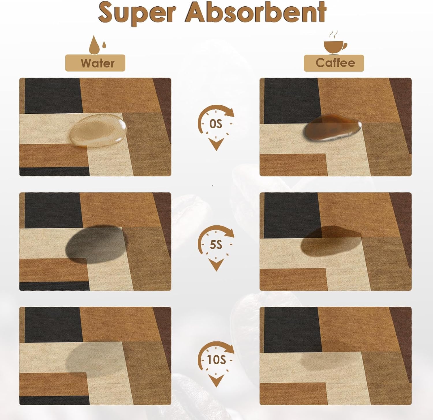 - [Super Absorbent] The coffee mats is reliable to absorb water quickly, no matter splashing coffee, or scattered water droplets, all gone real quick, the high density design makes air dry in seconds, and always keeps the table clean and tidy. It is one of practical and trustworthy coffee bar accessories.