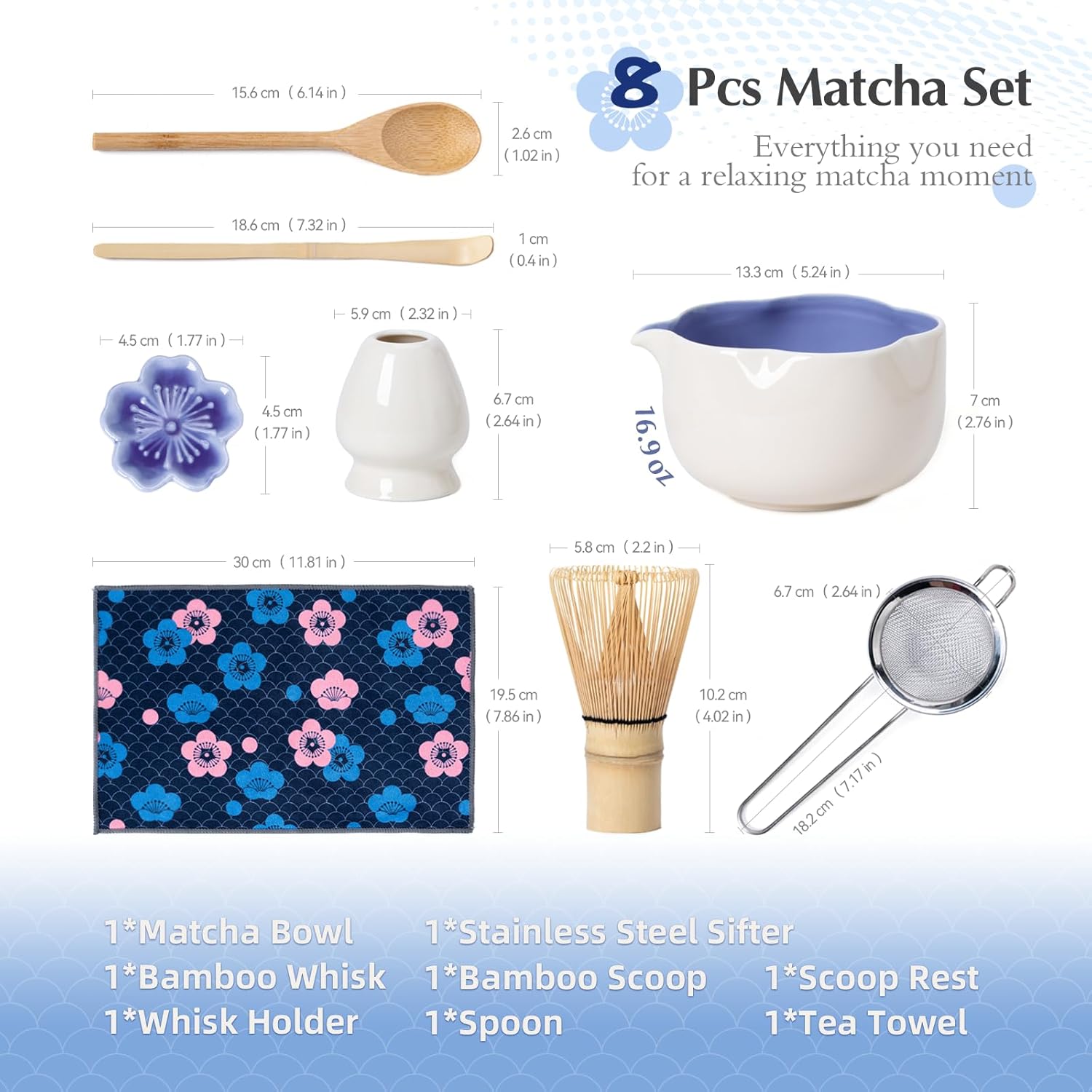 - 【PREMINM MATCHA SET】Includes a floral ceramic matcha bowl, handcrafted bamboo matcha whisk, whisk holder, bamboo scoop, scoop rest, fine mesh sifter, spoon, and a tea cloth — everything you need for a relaxing matcha moment.