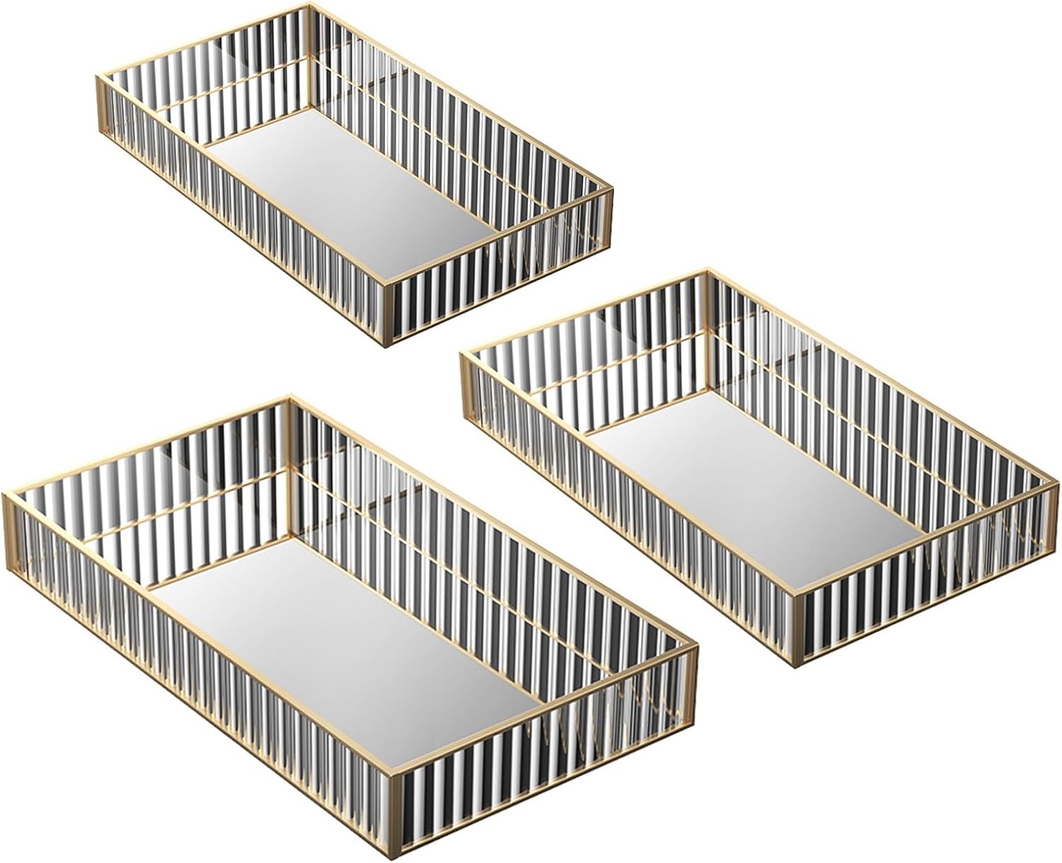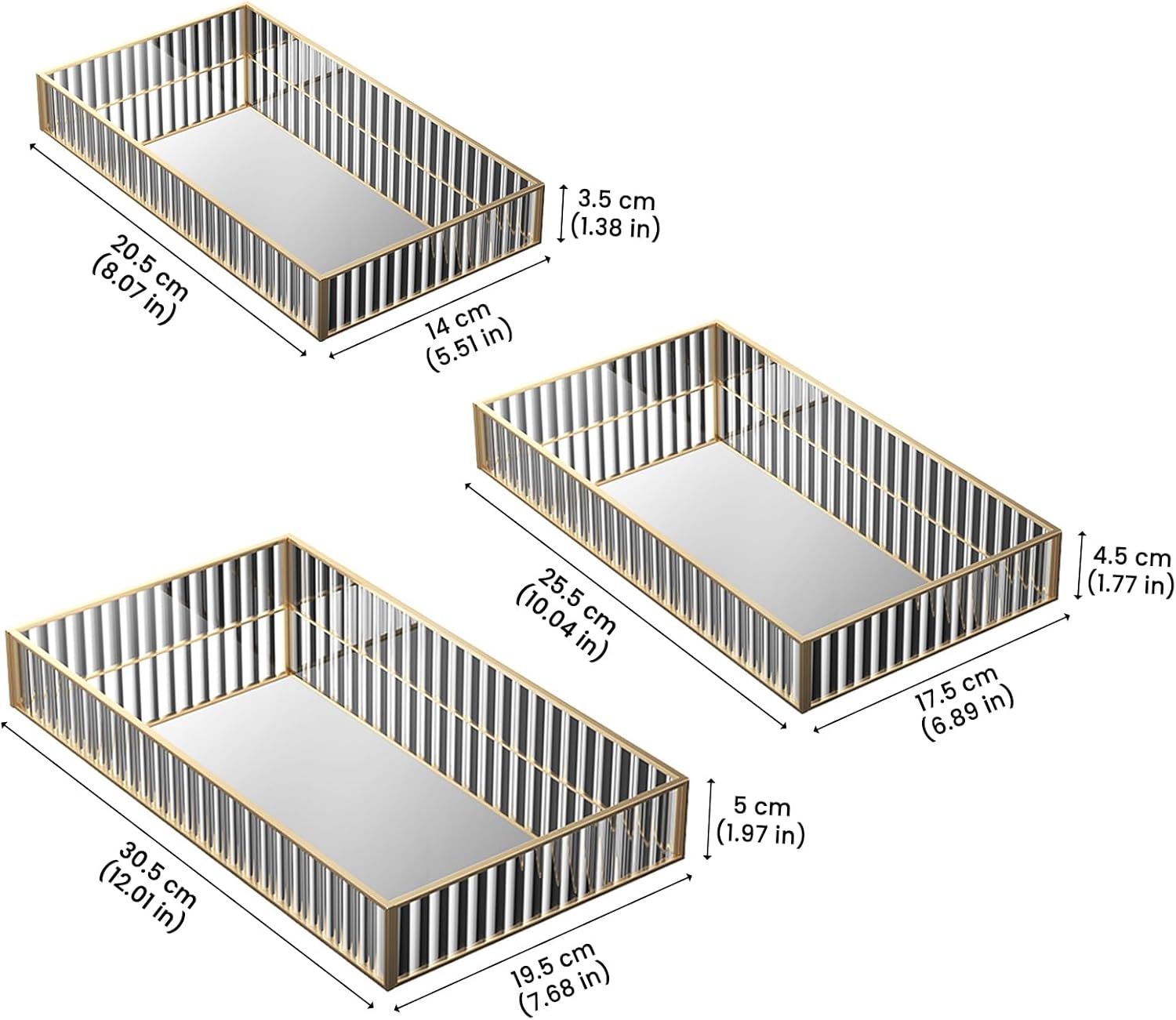 - GLASS VANITY TRAY SET OF 3:This glass tray set includes Small (8"L x 5.51"W), Medium (10"L x 6.89"W), and Large (12"L x 7.68"W) sizes – perfectly tiered to organize jewelry on your dresser, display perfume in the bathroom, or corral makeup on a vanity. No more cluttered countertops!