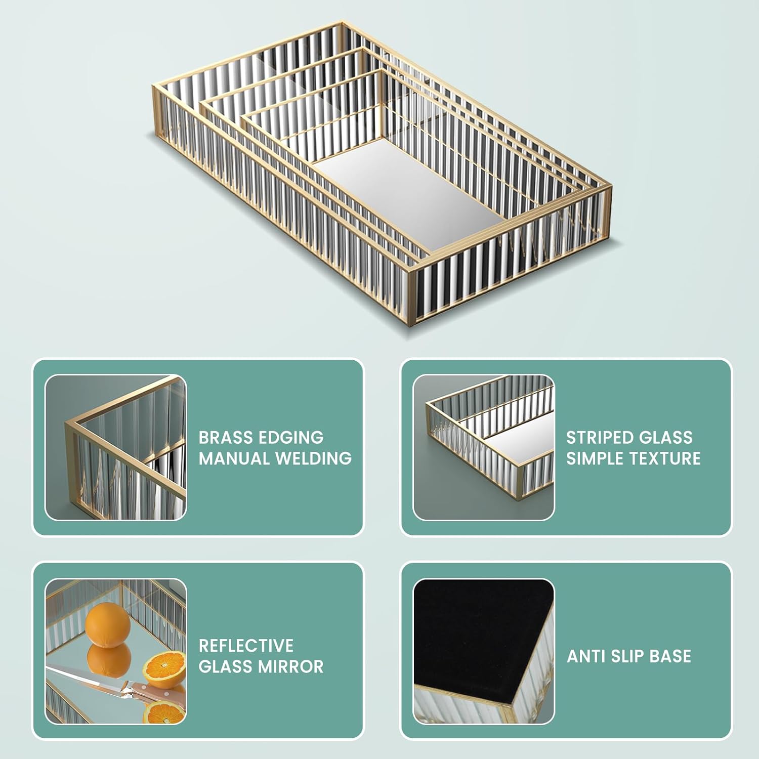 - ELEGANT APPEARANCE:This rectangular glass vanity tray features a gold brass trim around the outer edge. The elegant ribbed glass design showcases fine craftsmanship, with soft lines and a distinct classic American elegance. It exudes a warm, romantic charm and a natural romantic vibe.