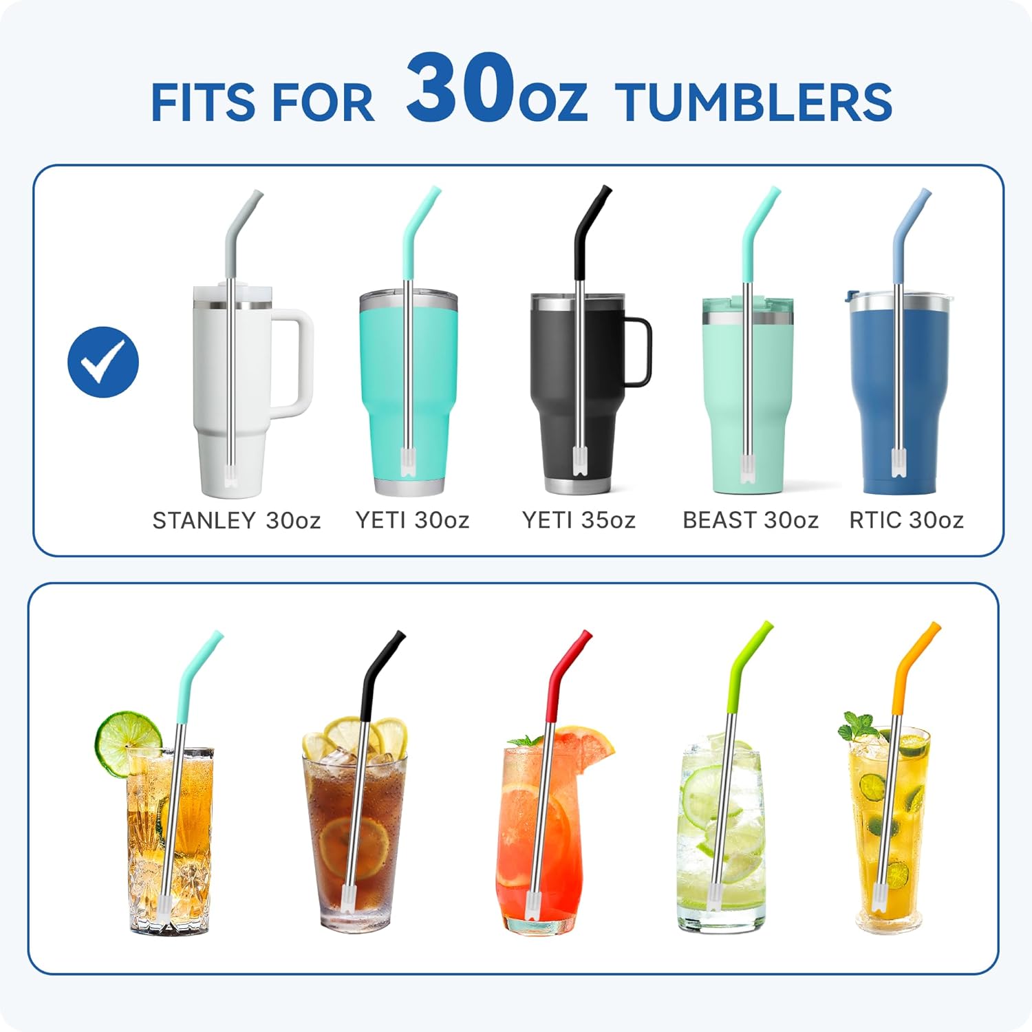 - For 30oz Tumblers :11.4 inch long bent straw is compatible with Stanley Quencher stainless steel tumblers (H1.0 and H2.0), Stanley 30oz tumblers with handles and Simple Modern 30oz tumblers, also suitable for other brands of 30oz tumblers, Please confirm the size before purchasing