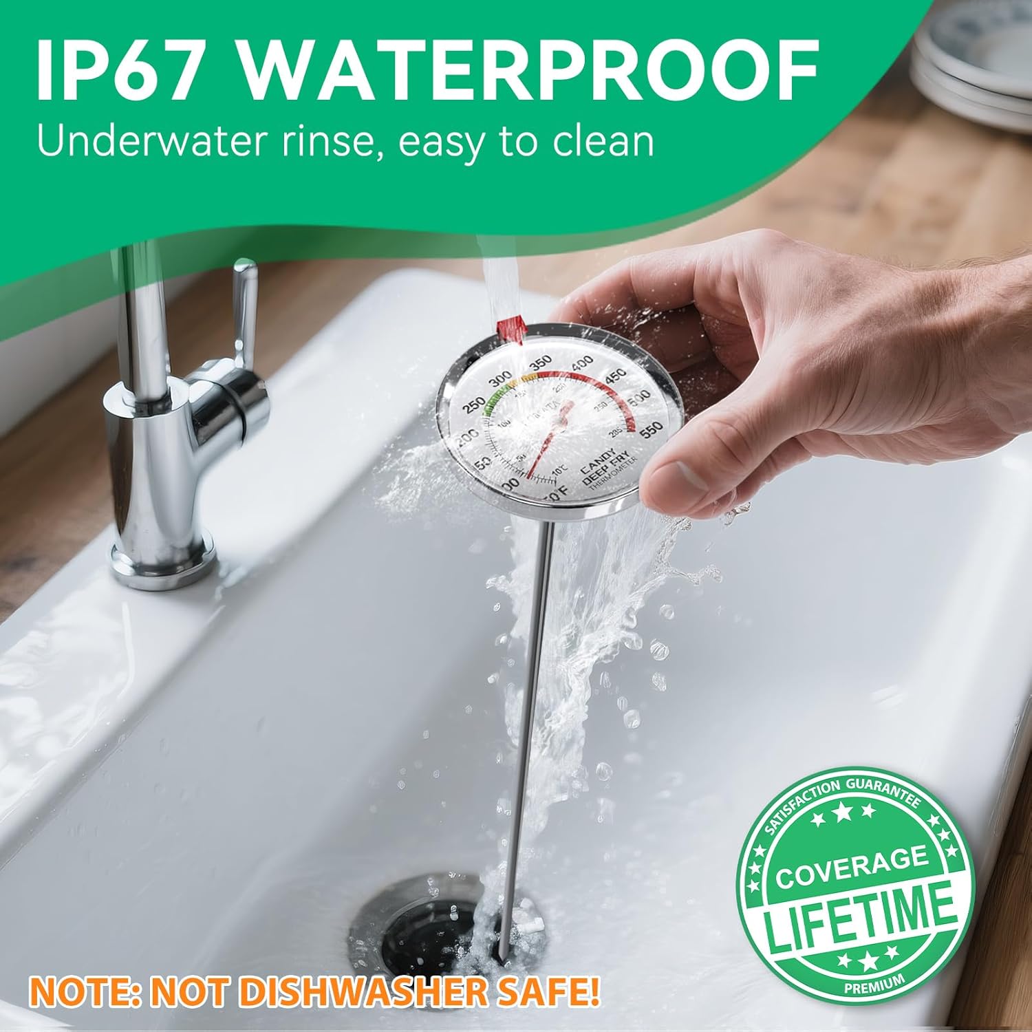 - [ Overall IP67 Waterproof ]: This thermometer is IP67 waterproof, which can prevent water vapor from entering the thermometer. It can be rinsed under water or soaked for a short time for easy cleaning. Note: Not dishwasher safe
