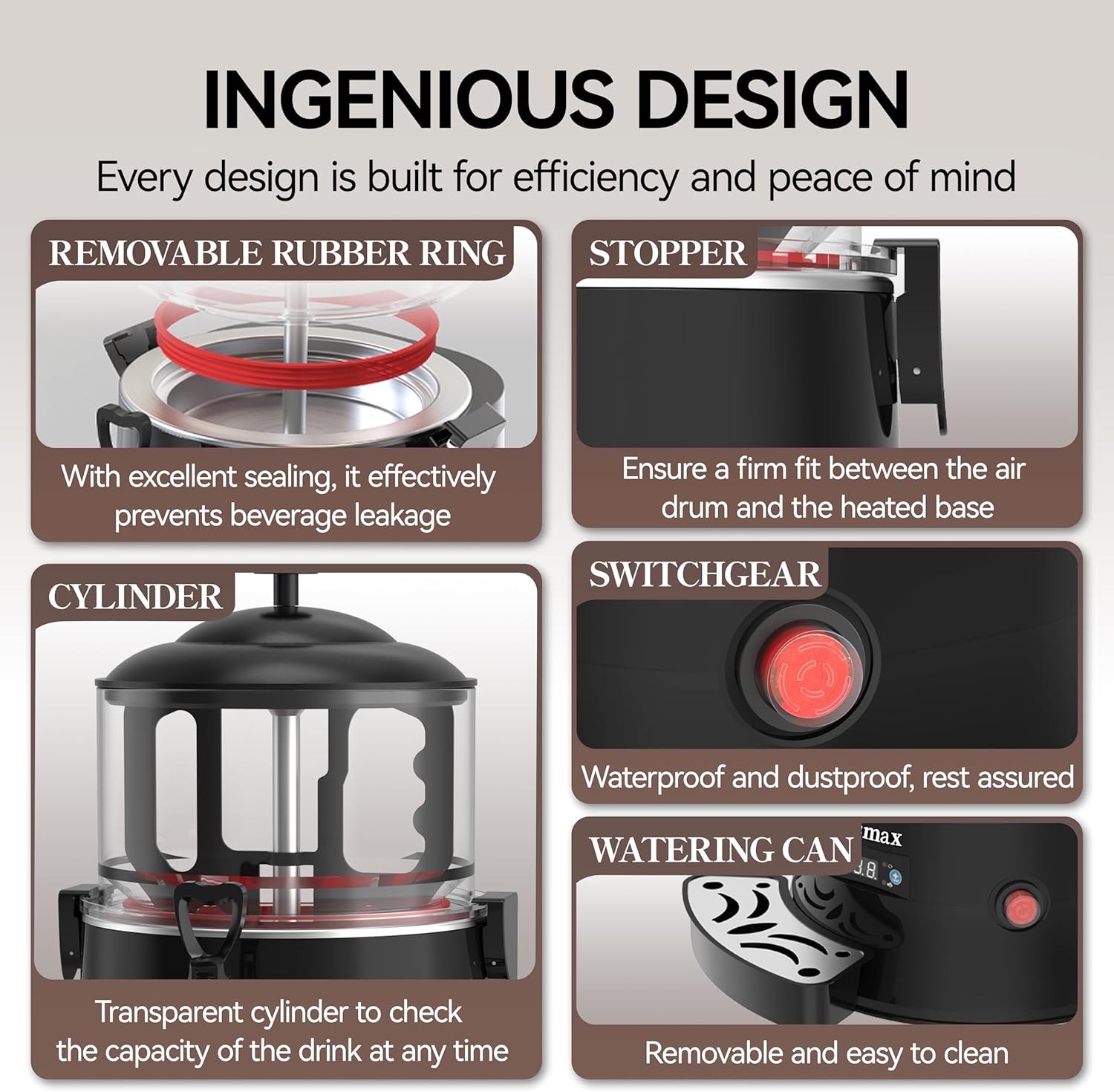 - 【Intelligent Temperature Control】 Vtsmax hot chocolate maker supports a wide temperature range of 30-90℃, intelligent & precise temperature control, set the temperature of the drink according to your needs. LED touch panel one-key operation, stainless steel circulating heated plate uniform heat conduction, to prevent the hot drinks from settling &layering, to maintain the best taste