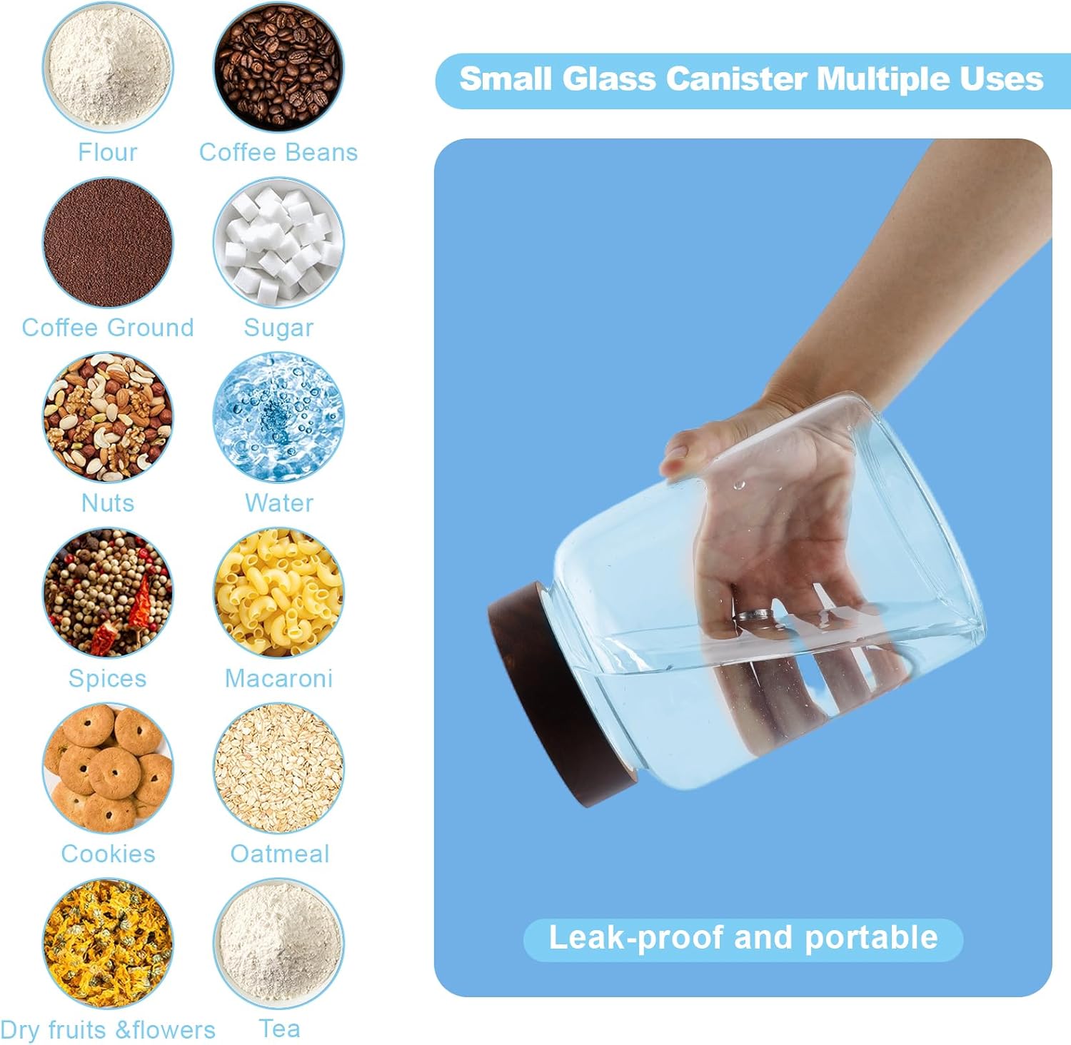 - 【WIDE APPLICATIONS】 Glass kitchen canisters for pantry organization and storage are suitable for storing various dried ingredients to retain their freshness, with clear glass jars, you can easily see inside and quickly find the ingredients you need.Glass jars with wood lids perfect for storing dry food , such as,cookies,dried beans,pepper,oatmeal,jams,chutneys, rice, flour, tea, coffee, biscuits, candy,cheese,flour, sugar, seeds,etc. Keep your kitchen tidy and safe,saving space and convenient .