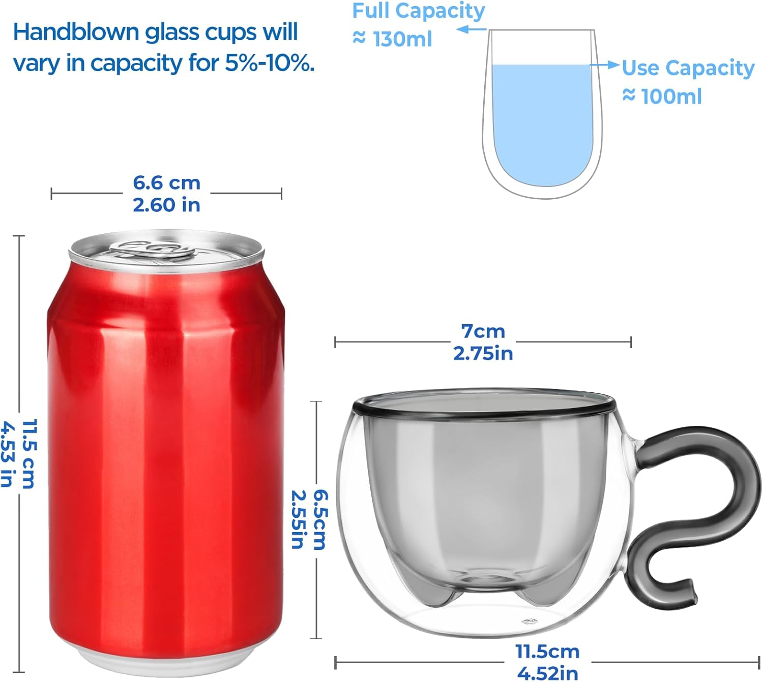 - Package Includes: 2 x 130 ml (4.4 oz) - full capacity. We recommend that you can easily fill the cup with 100 ml (3.4 oz) of liquid. We offer friendly product support (within 18 months). All glass products are fragile, so please be careful when using and cleaning. Hand washing is recommended.