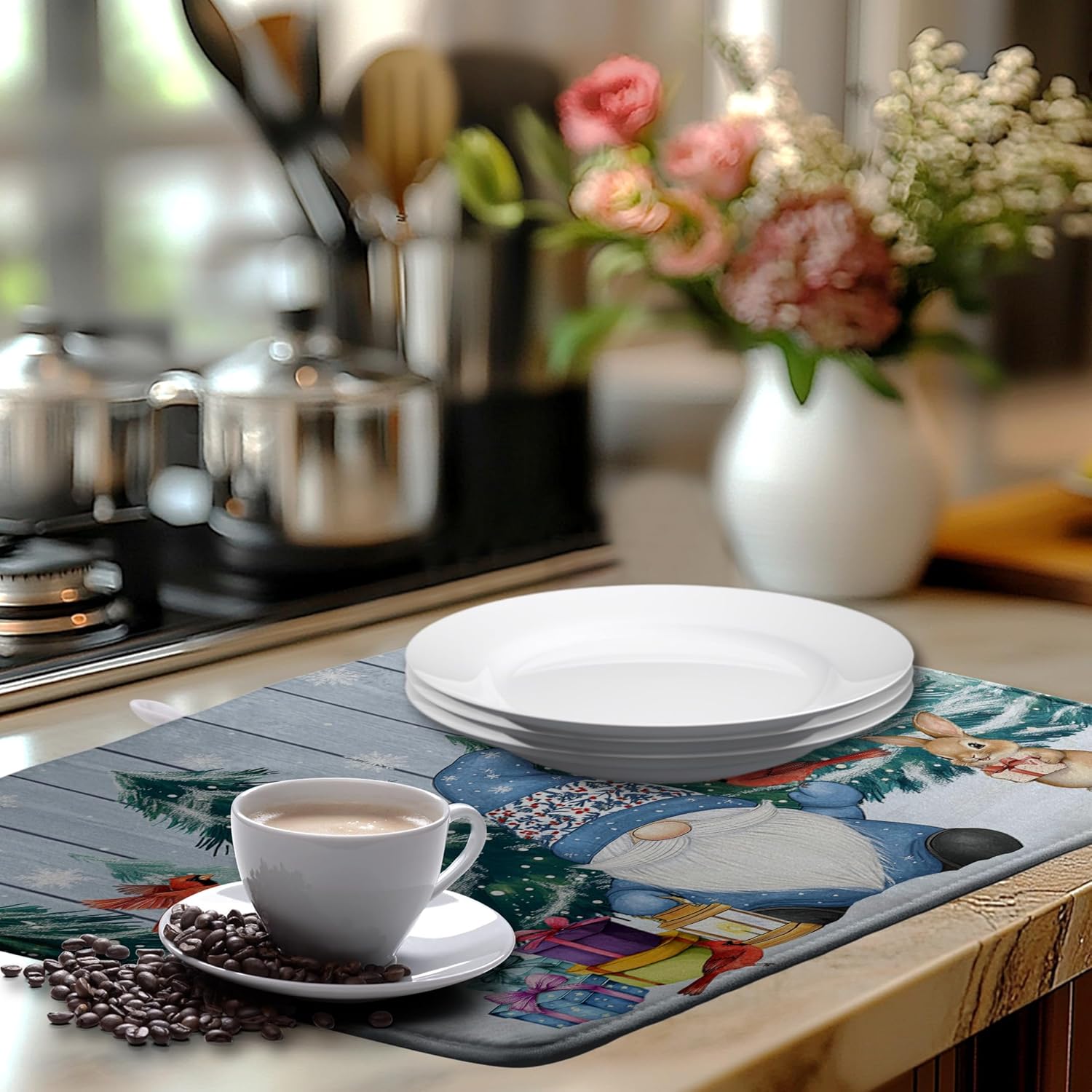 Winter Gnome Dish Drying Mat Christmas Tree Snowman Large Kitchen Mats Dish Drying Pad Bird Absorbent Dish Dryer Mat for Kitchen Countertops Microfiber Drainer Pad Dish Drying Mats (18x24 in)
