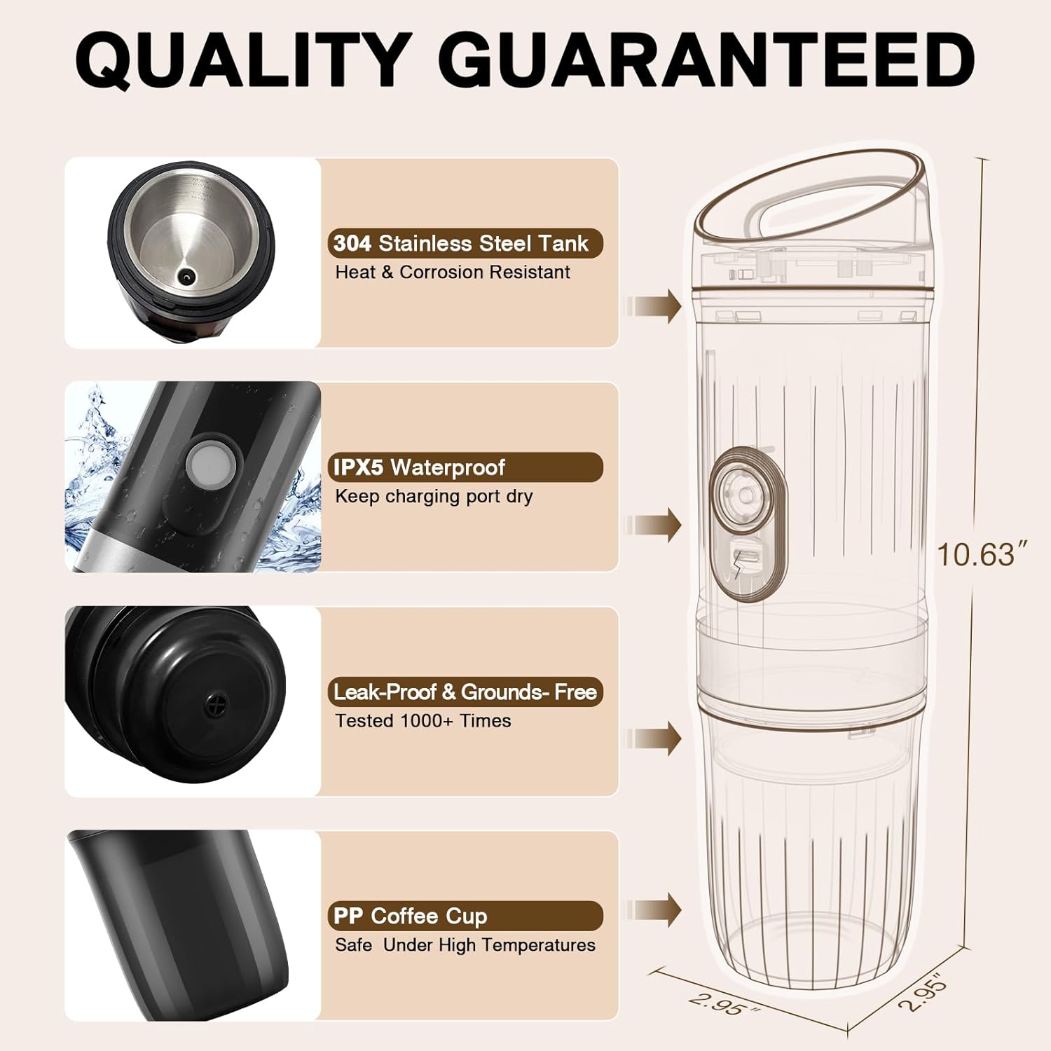 - ăQuality AssuranceăThe coffee machine features a water tank made of 304 stainless steel and a coffee cup made of food-grade PP material, ensuring no harmful substances are released at high temperatures. It has undergone thousands of tests to guarantee no water or coffee powder leakage. The device is IPX5 waterproof (please avoid getting water into the charging port) and built with a durable, stable body. If you encounter any issues during use, feel free to contact us anytime.