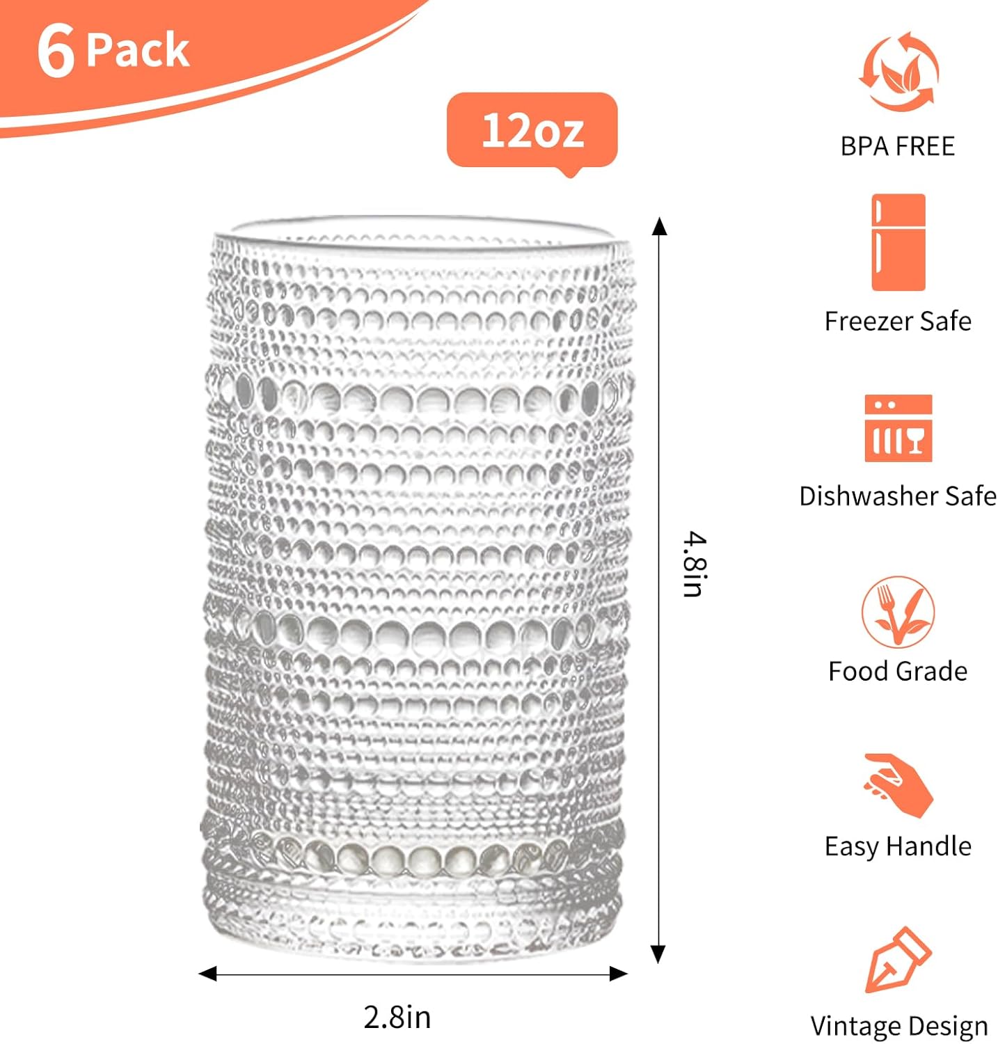 - 【Premium Set of 6 Unified Glasses】Enjoy a perfectly matched set of six 12oz vintage hobnail glass cups set(2.8" top x 4.8" tall). Crafted for versatile use with whisky,water, iced coffee, smoothies, cocktails, and more. No mismatched sizes – every glass delivers generous capacity in elegant harmony.
