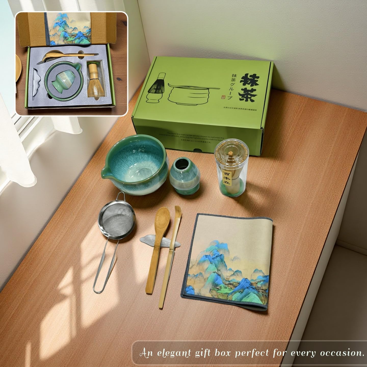 - 【8-Piece Complete Matcha Preparation Set】 This kit includes all core accessories: ceramic bowl (chawan), bamboo whisk (chasen), bamboo scoop (chashaku), bamboo spoon, ceramic whisk holder, ceramic scoop stand, cotton tea cloth (chakin), and matcha powder sifter. Designed as a ready-to-use solution for traditional matcha making.