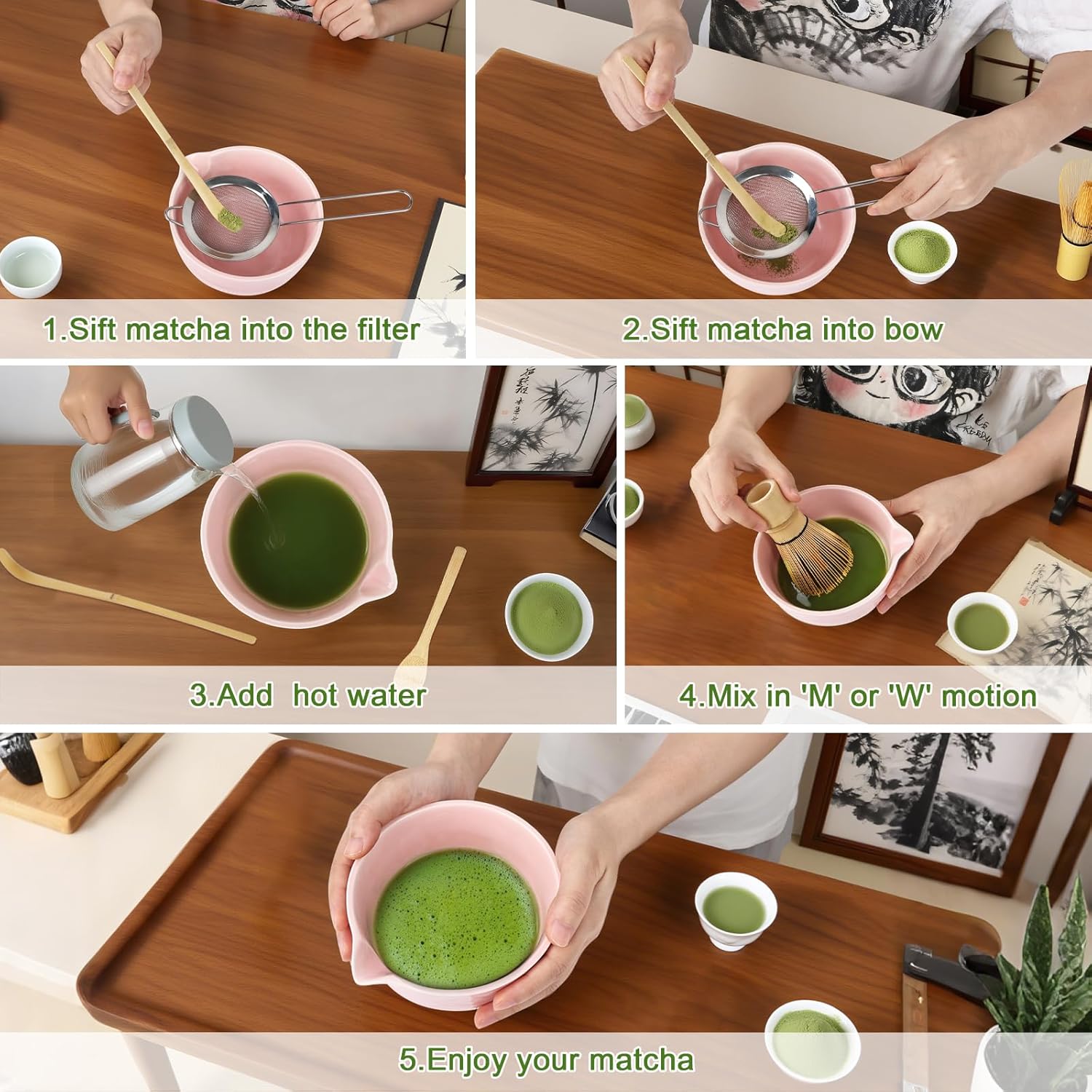 - Complete Matcha Set: This matcha kit includes 9Pcs essentials tools for an authentic matcha experience: 1 bamboo matcha whisk, 2 bamboo spoons, 1 spoon stand, 1 stainless steel sifter, 1 ceramic matcha bowl, 1 whisk holder, 1 tea towel, 1 Hand book. This matcha set covers all the necessary steps for making matcha, enjoy a more pleasant matcha time.